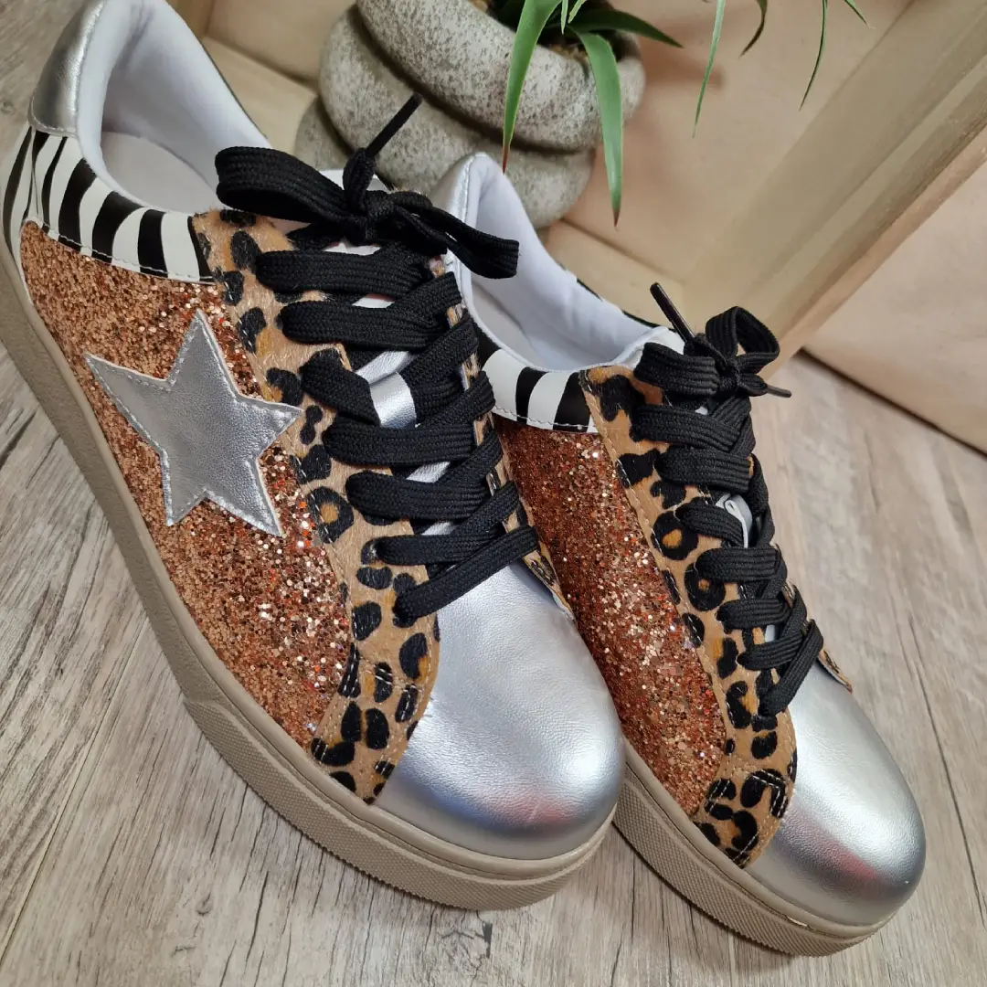Baskets basses femme imprimé zèbre Élue par Nous, rehaussées d’une étoile contrastante pour un look urbain chic. Tige légère et respirante, semelle souple en caoutchouc pour un confort optimal, lacets plats pour un ajustement parfait. Polyvalentes et tendance, elles s’adaptent à toutes vos tenues, du casual décontracté au chic affirmé, en toute saison.