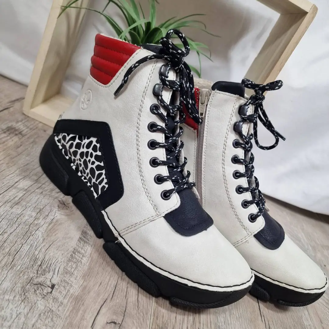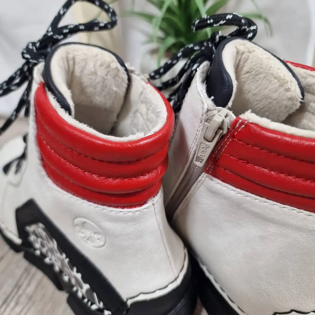 Baskets montantes femme Rieker – Beige & rouge – Doublure chaude velours et fourrure d’agneau – Confort et style au quotidien
