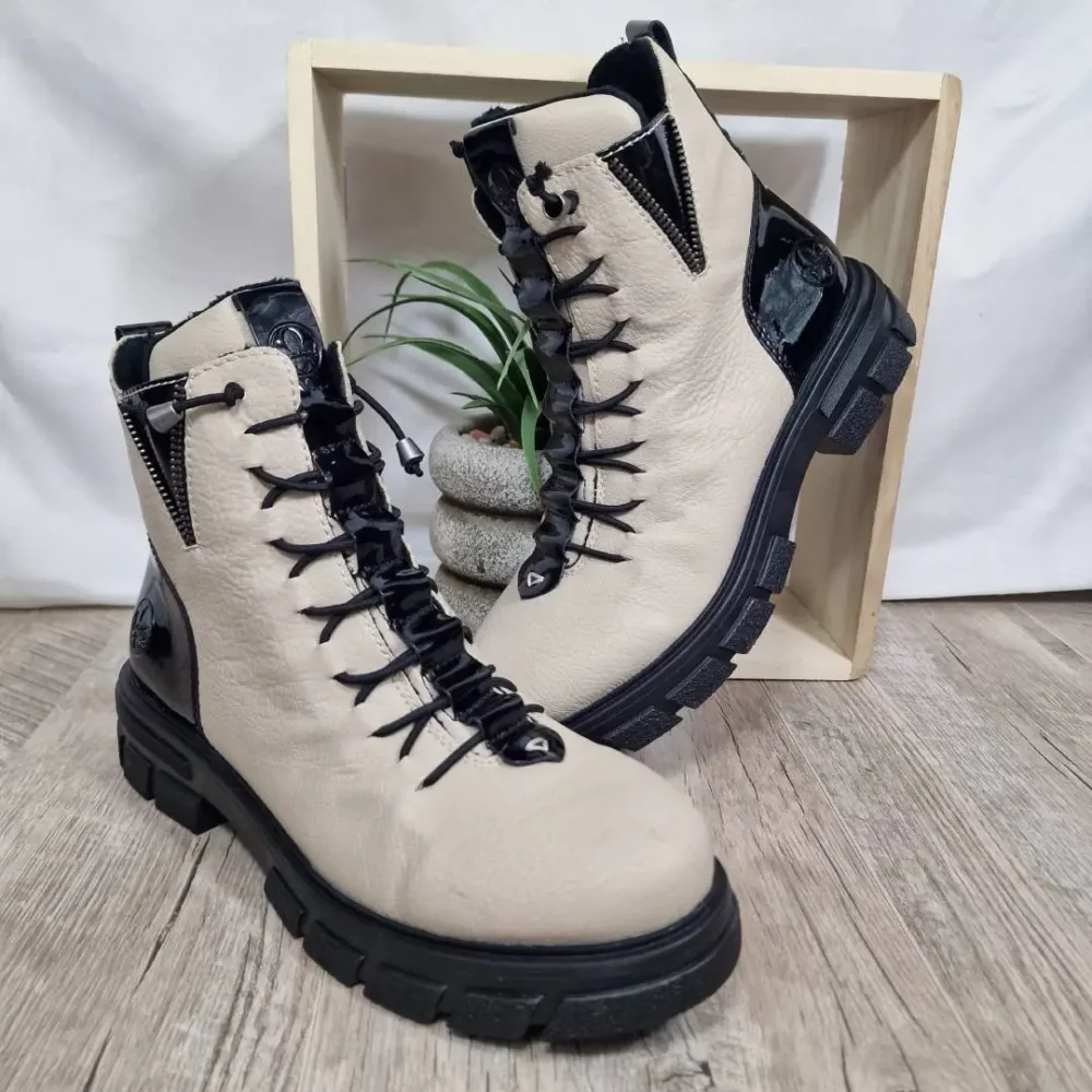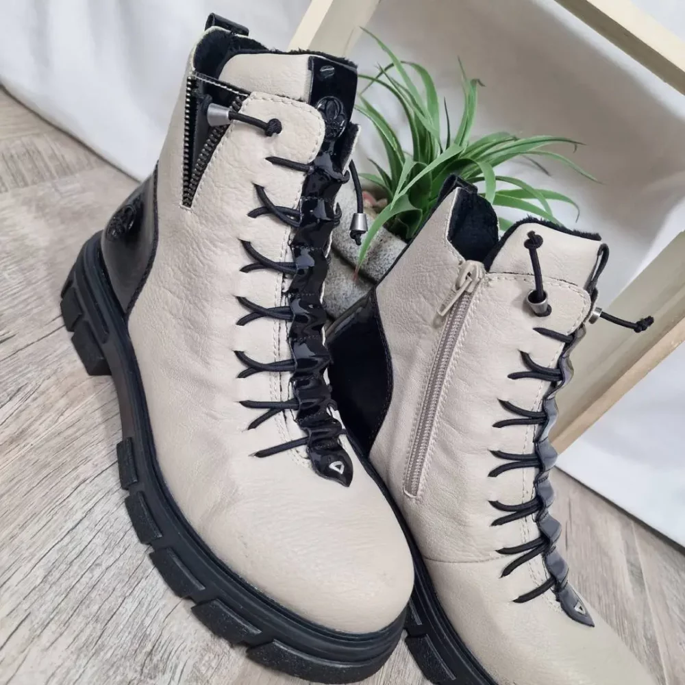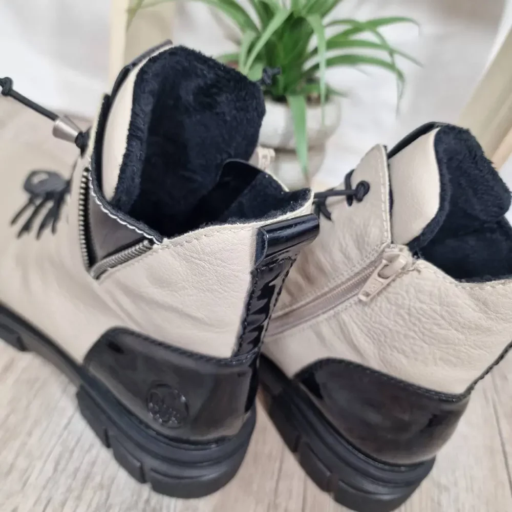 Alliez confort et style avec ces biker boots Rieker beiges pour femme. Doublure en velours et fourrure synthétique pour des pieds chauds et douillets, semelle TR adhérente pour stabilité, fermeture éclair pratique et talon bloc élégant. Idéales pour l’hiver, elles combinent chaleur, maintien et look moderne au quotidien.