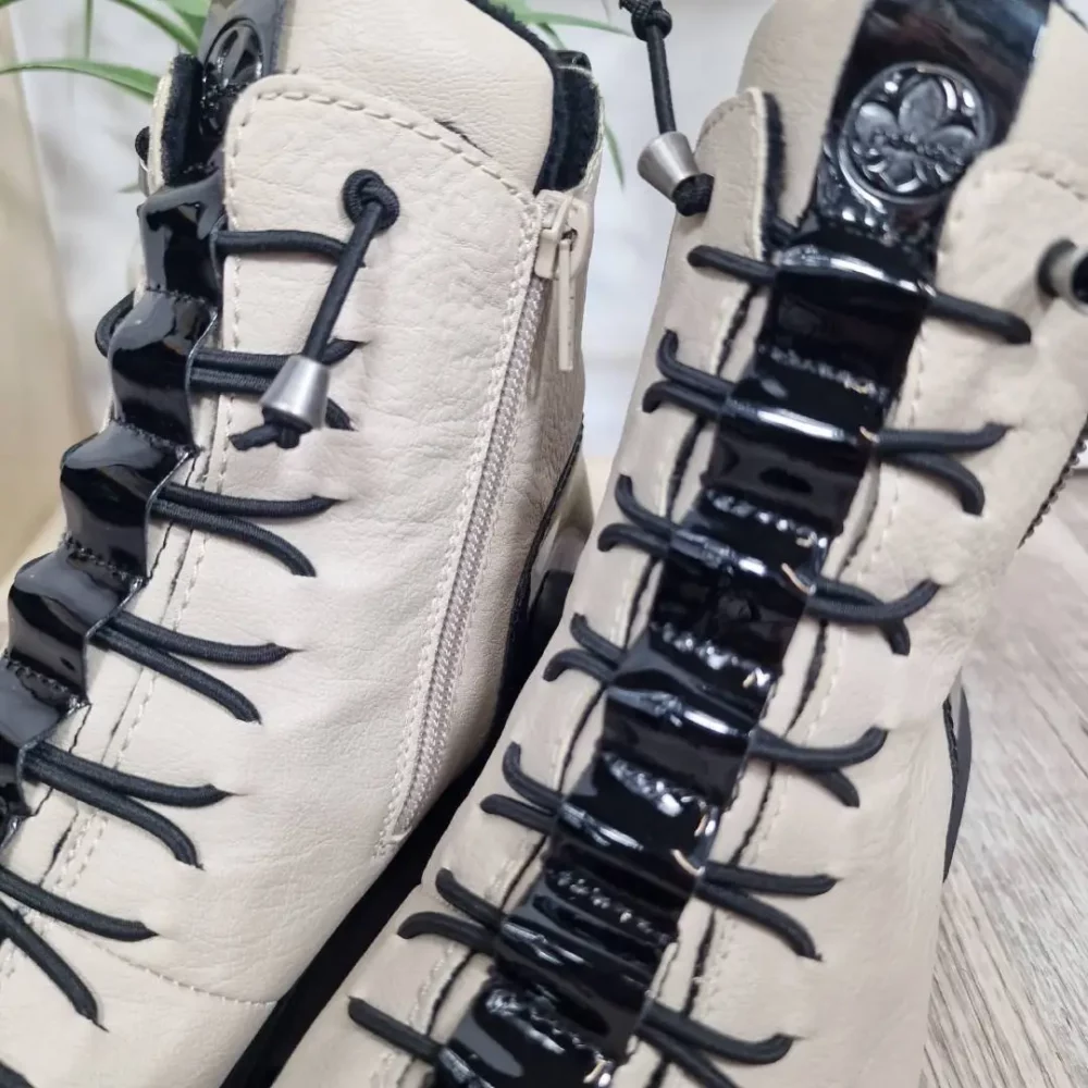 Le design de ces biker boots Rieker combine parfaitement mode et fonctionnalité. Le beige doux et naturel s’adapte à toutes les garde-robes, tandis que les détails noirs apportent du caractère et une touche d’originalité. Cette combinaison subtile permet de les porter facilement au quotidien tout en affichant un style affirmé. Que vous recherchiez une chaussure confortable pour vos trajets ou une pièce tendance pour vos sorties, ces bottes sont un choix polyvalent et élégant.