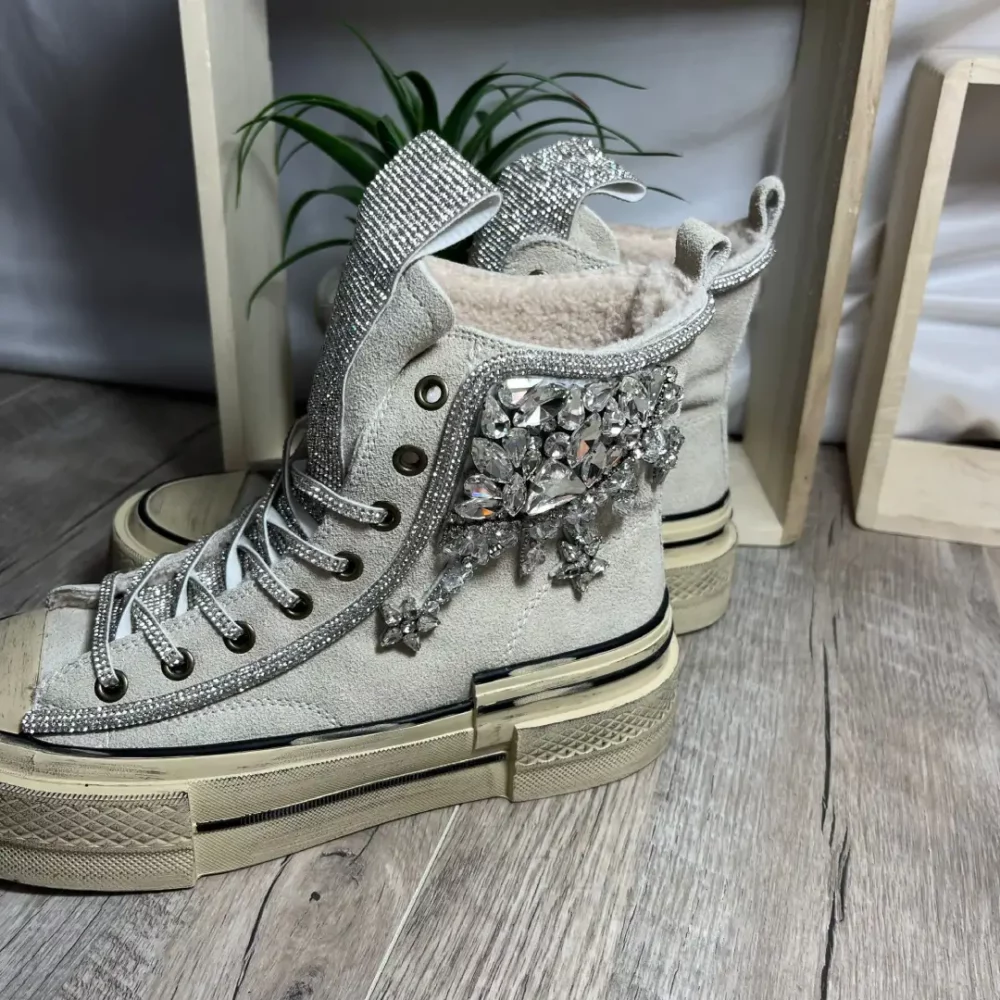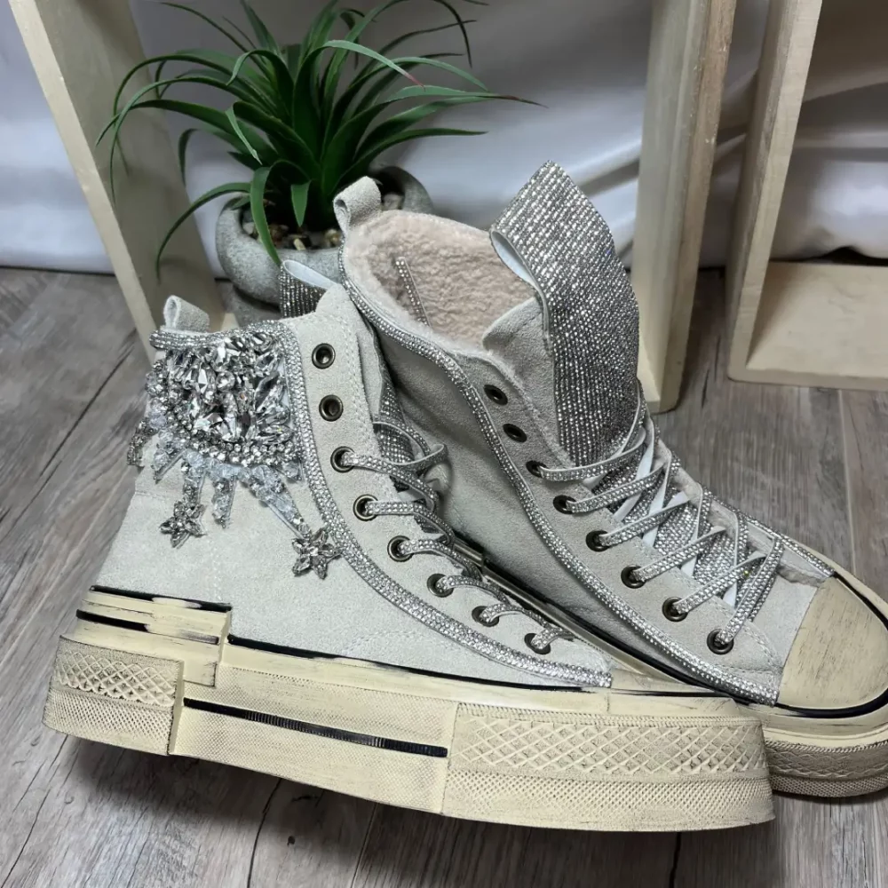 Osez la sneaker montante Nan-Ku EFD-21C blanc : un modèle raffiné et lumineux orné de strass et cristaux, alliant confort, chaleur et élégance. Sa teinte blanche intemporelle sublime chaque détail, pour un look chic en toute occasion. Parfaite pour l’automne-hiver, elle conjugue audace, féminité et qualité artisanale.