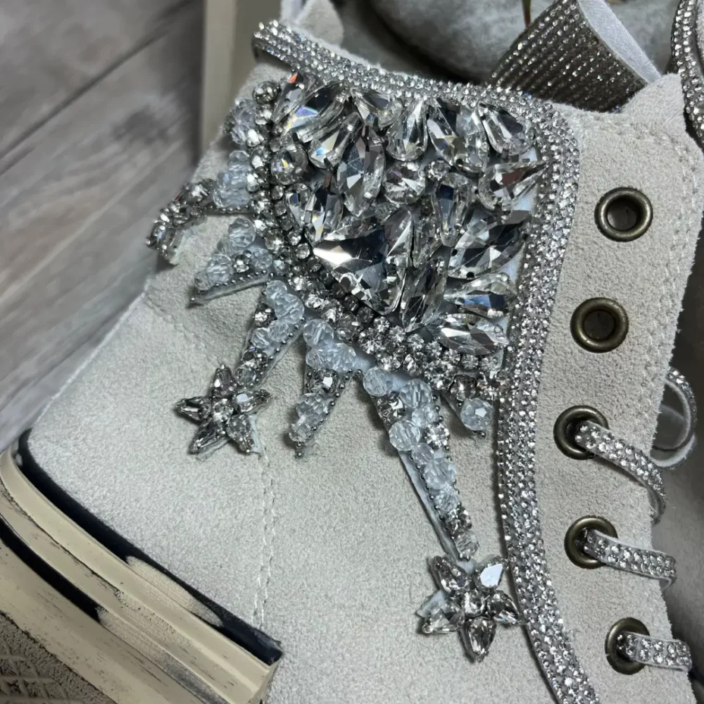 Fruit du savoir-faire de la maison Nan-Ku, cette sneaker est bien plus qu’une simple chaussure. Chaque détail est pensé pour séduire autant le regard que le pied. Les broderies fines, les motifs cristallins en forme de fleurs et d’étoiles, ainsi que les finitions cousues main témoignent d’un niveau de qualité exceptionnel.