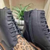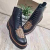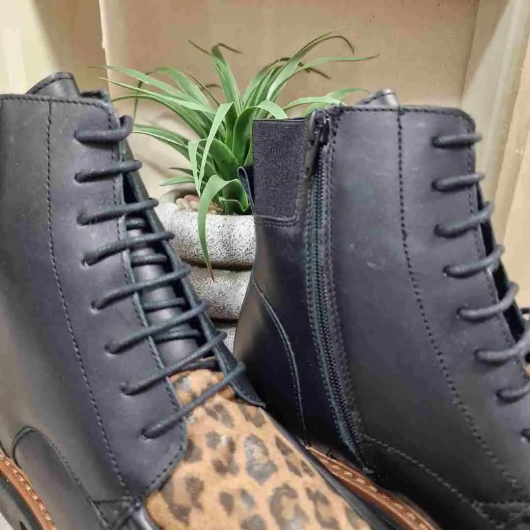 La bottine VERNEIX d’Élue par Nous conjugue élégance et praticité. En cuir noir premium, elle se distingue par un motif léopard raffiné et une semelle noire bordée de marron. Son double système de fermeture, lacets et zip intérieur, assure confort et rapidité d’enfilage. Avec son intérieur cuir et textile, sa bande élastique et sa tige mi-haute, elle offre maintien, modernité et style en toutes occasions.