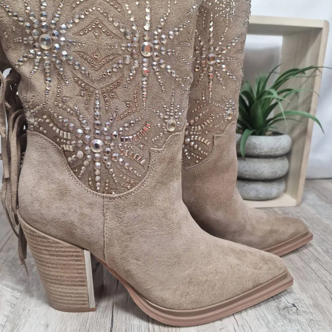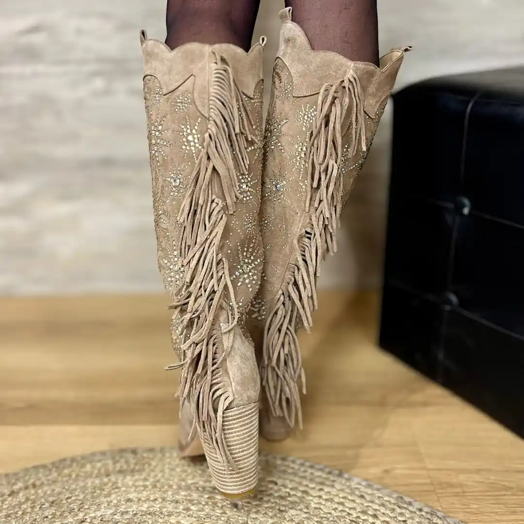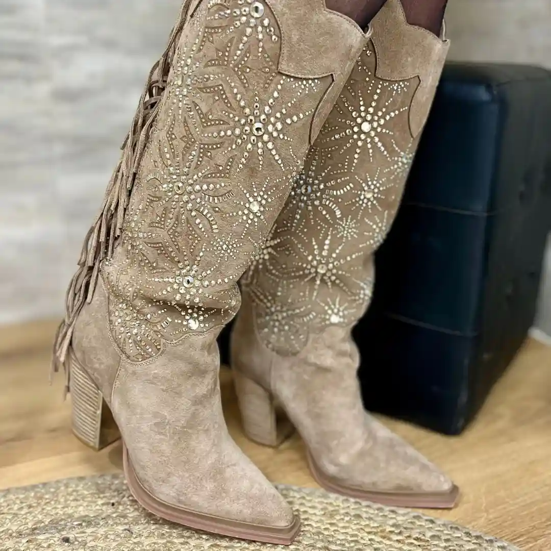 La botte santiag Alma en Pena est une pièce forte et singulière qui incarne à la fois l’élégance, le caractère et l’originalité. Conçue pour les femmes qui aiment affirmer leur style, elle allie l’esprit western au raffinement européen. Avec sa tige haute travaillée, ses franges dynamiques et ses incrustations scintillantes, elle se distingue comme un modèle iconique de la collection.