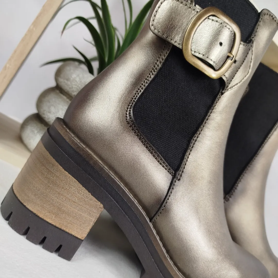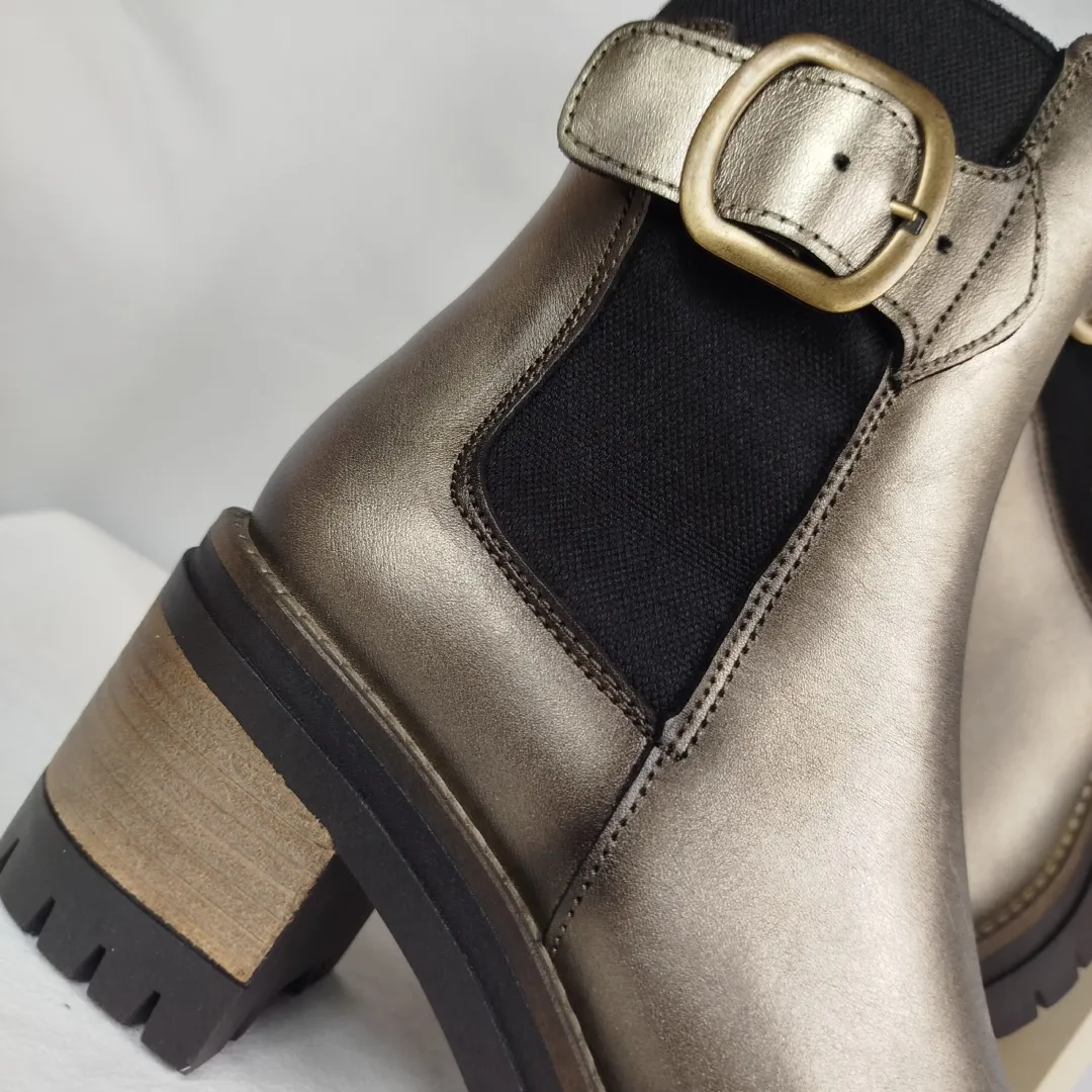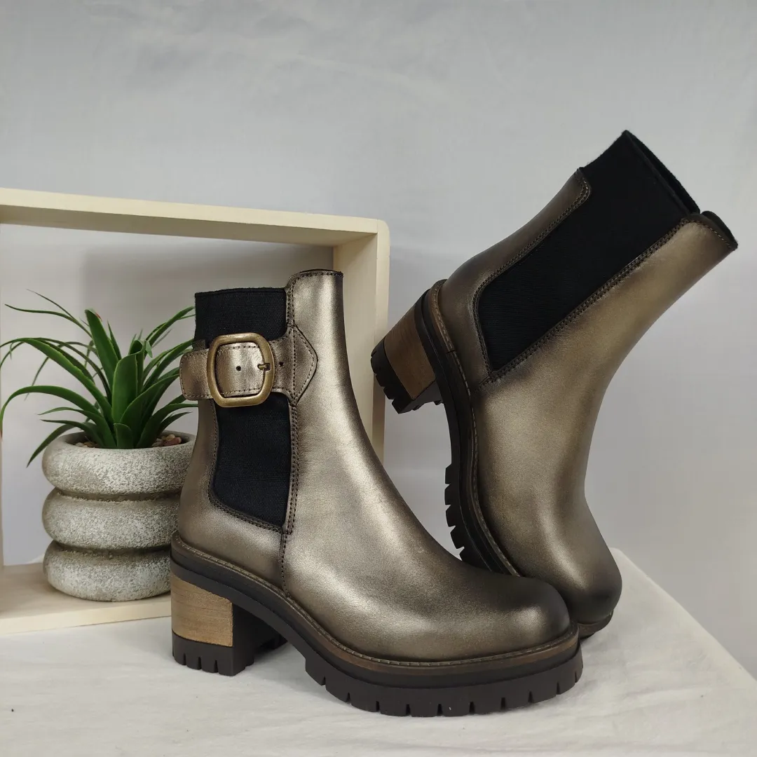 Ce qui fait la signature visuelle de cette botte, c’est sa couleur bronze métallisée. Élégante, contemporaine et résolument audacieuse, cette teinte confère à la botte une allure unique. Elle capte la lumière subtilement et ajoute une touche de sophistication rock à n’importe quelle tenue.