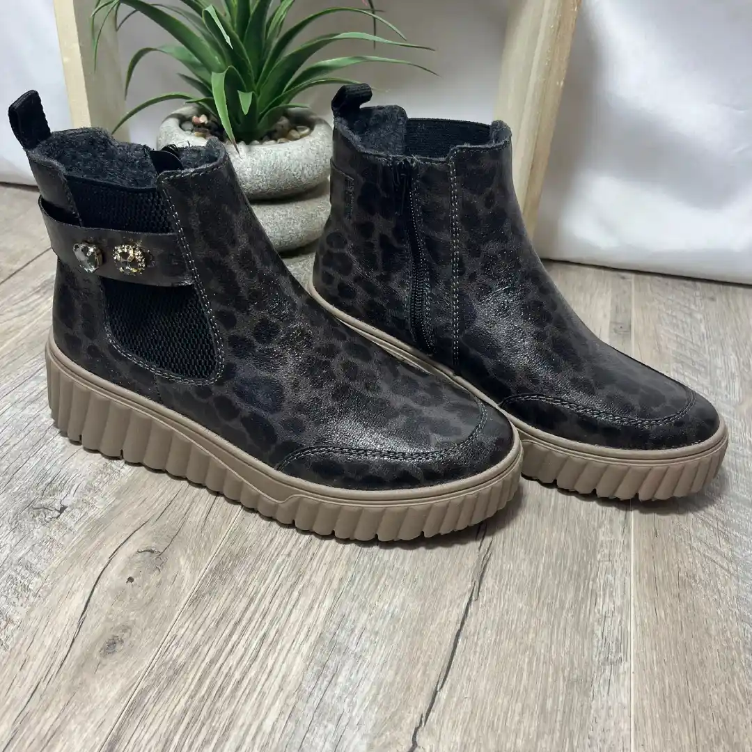 Alliez style et confort avec ces chelsea boots Rieker grises pour femme. Fermeture éclair et insert élastique pour un enfilage facile, semelle à plateau légère et adhérente pour une marche stable, et semelle intérieure amovible pour un confort pratique. Doublure en velours et fourrure synthétique pour des pieds chauds et douillets, avec imprimé léopard tendance.