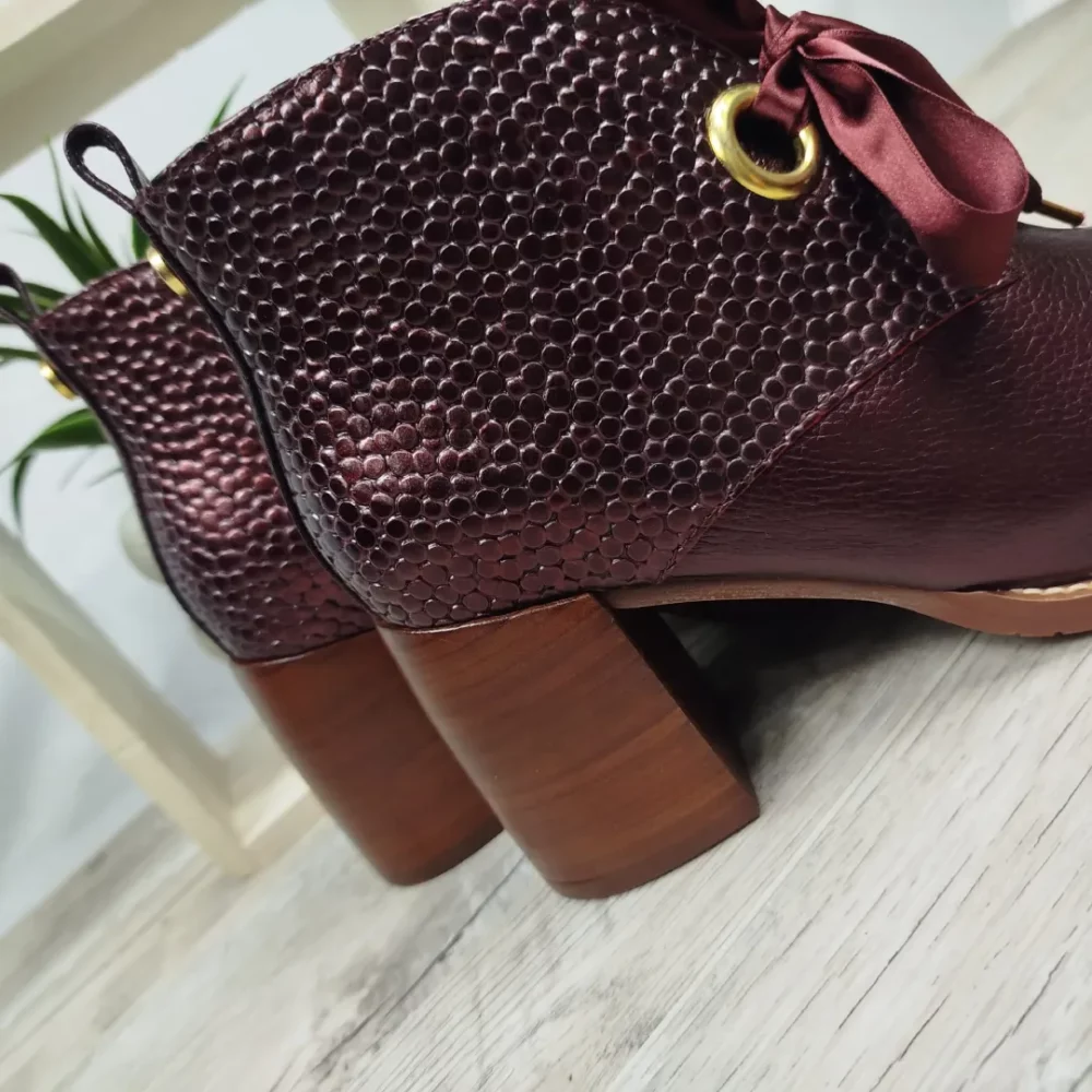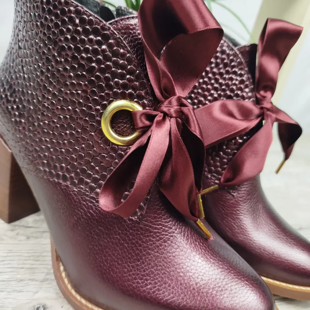 Dès le premier coup d’œil, ces bottines captivent par leur coloris bordeaux intense, à la fois chic et audacieux. Cette couleur, subtilement nuancée, apporte une touche d’originalité sans jamais tomber dans l’excentricité. Elle s’accorde avec une large palette de tenues — du noir classique au beige doux, en passant par les gris, les kakis ou les imprimés automnaux. C’est une teinte qui rehausse instantanément un look, tout en conservant une grande facilité d’association.