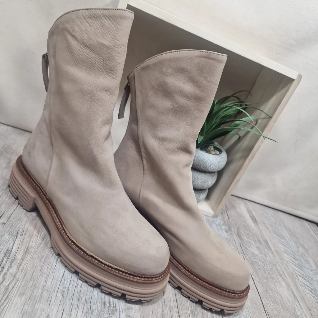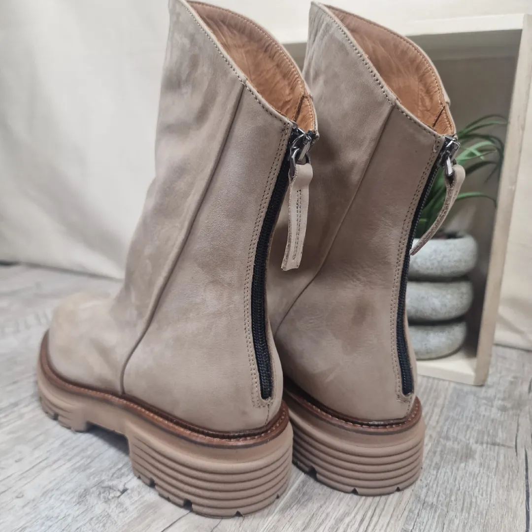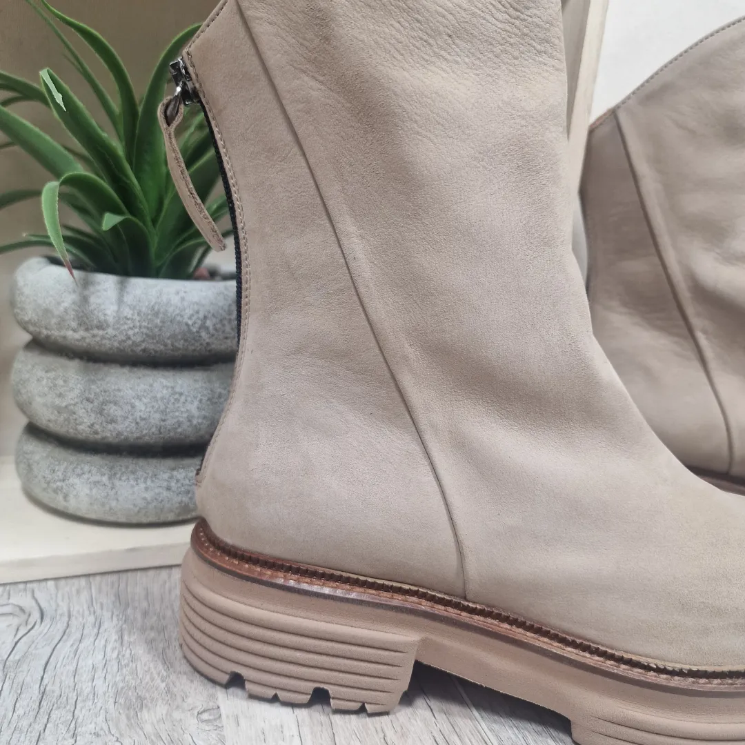 Bottines Mat:20 Wash Sable en cuir lisse, fabriquées en Italie. Un modèle chic et naturel, au coloris sable et à la semelle beige, alliant élégance et confort. Zip arrière pratique, semelle intérieure rembourrée et style épuré pour un look décontracté ou habillé. Idéales au quotidien, en édition limitée.