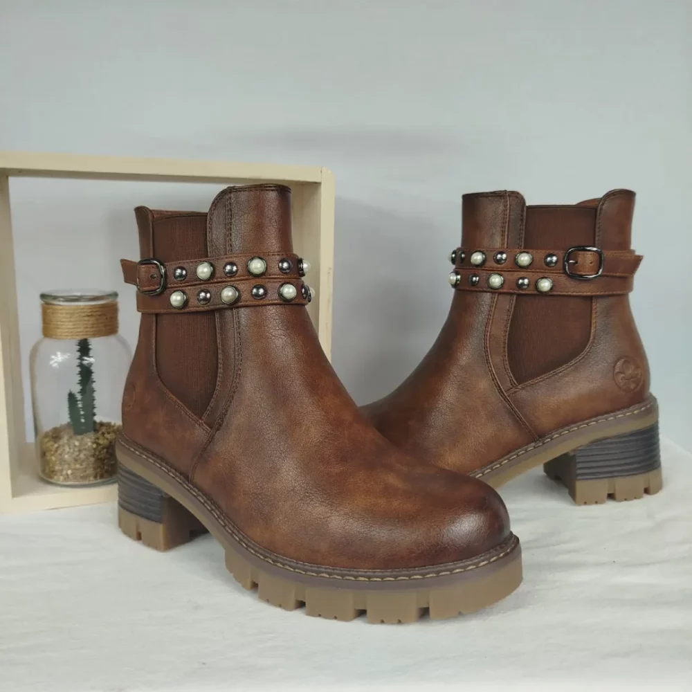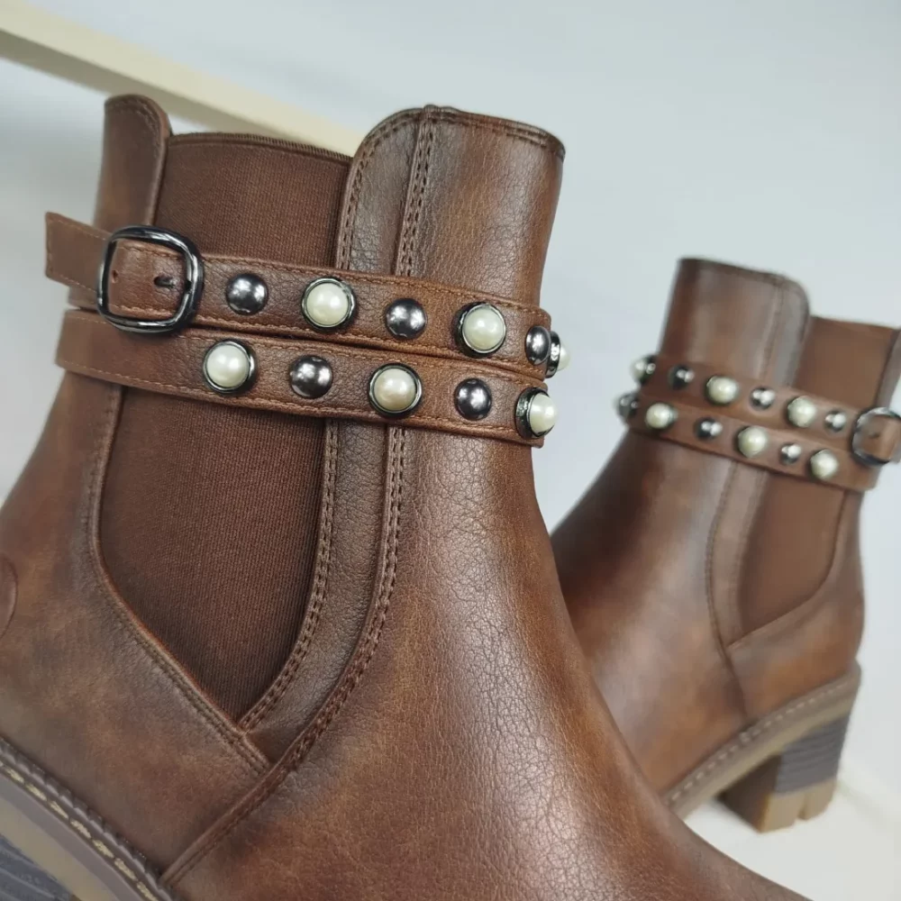Leur originalité réside aussi dans la lanière décorative ornée d’une boucle à ardillon accompagnée de délicates perles. Ce subtil ornement ajoute une touche sophistiquée et féminine à l’ensemble, faisant de ces bottines un véritable atout mode.