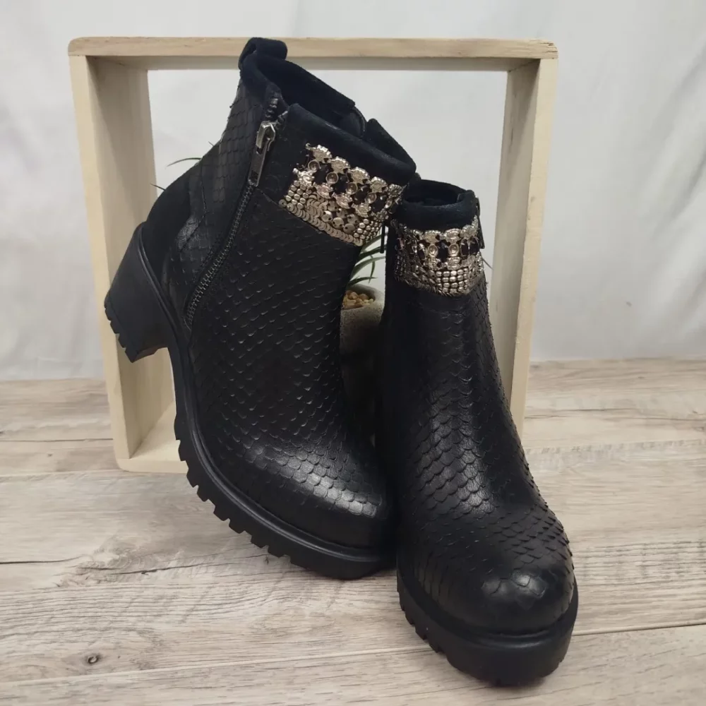 Au-delà de leur apparence stylée, ces bottines noires sont conçues pour offrir un confort optimal. Le talon de 4 cm, ni trop haut ni trop bas, assure une posture équilibrée et un bon maintien du pied. La semelle style biker est pensée pour garantir une excellente adhérence sur différents types de sols, vous permettant de marcher en toute sécurité, même sur des surfaces glissantes.