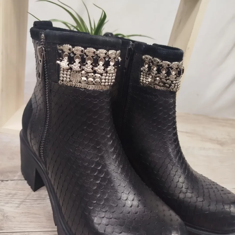 Ce qui distingue immédiatement ces bottines Métamorf’ose, c’est leur semelle inspirée du style biker. Ce design robuste et tendance confère à la chaussure une allure affirmée et contemporaine, idéale pour les femmes qui aiment mêler mode et esprit rebelle. La semelle est conçue pour offrir une cambrure de 4 cm, une hauteur de talon parfaitement équilibrée qui combine esthétique et confort.