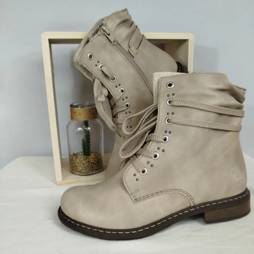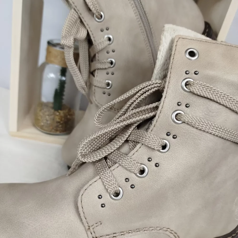 Ces bottines de la marque Rieker Anti-stress de couleur beige sont parfaites pour un look casual roots. Voici des chaussures montantes à lacets en simili cuir dotées d’une doublure chaude en textile, godillot confortables taillés pour l’hiver, chaussures très souples et légères pour un confort de marche excellent.