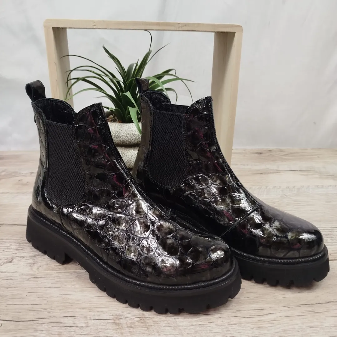 Le cuir vernis à effet croco confère à ces boots un look sophistiqué et tendance, apportant une touche de luxe à toutes vos tenues. Que vous souhaitiez adopter un style habillé ou décontracté, ces bottines s’adaptent parfaitement à vos envies et à vos occasions. Leur design polyvalent vous permet de les porter aussi bien avec un pantalon élégant, une jupe fluide ou un jean casual, pour un rendu toujours réussi.
