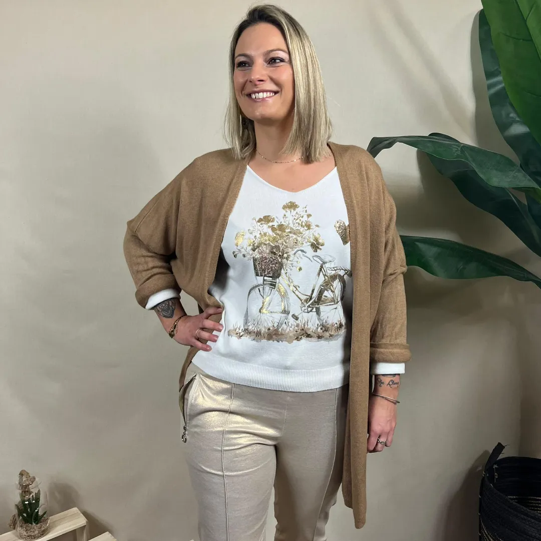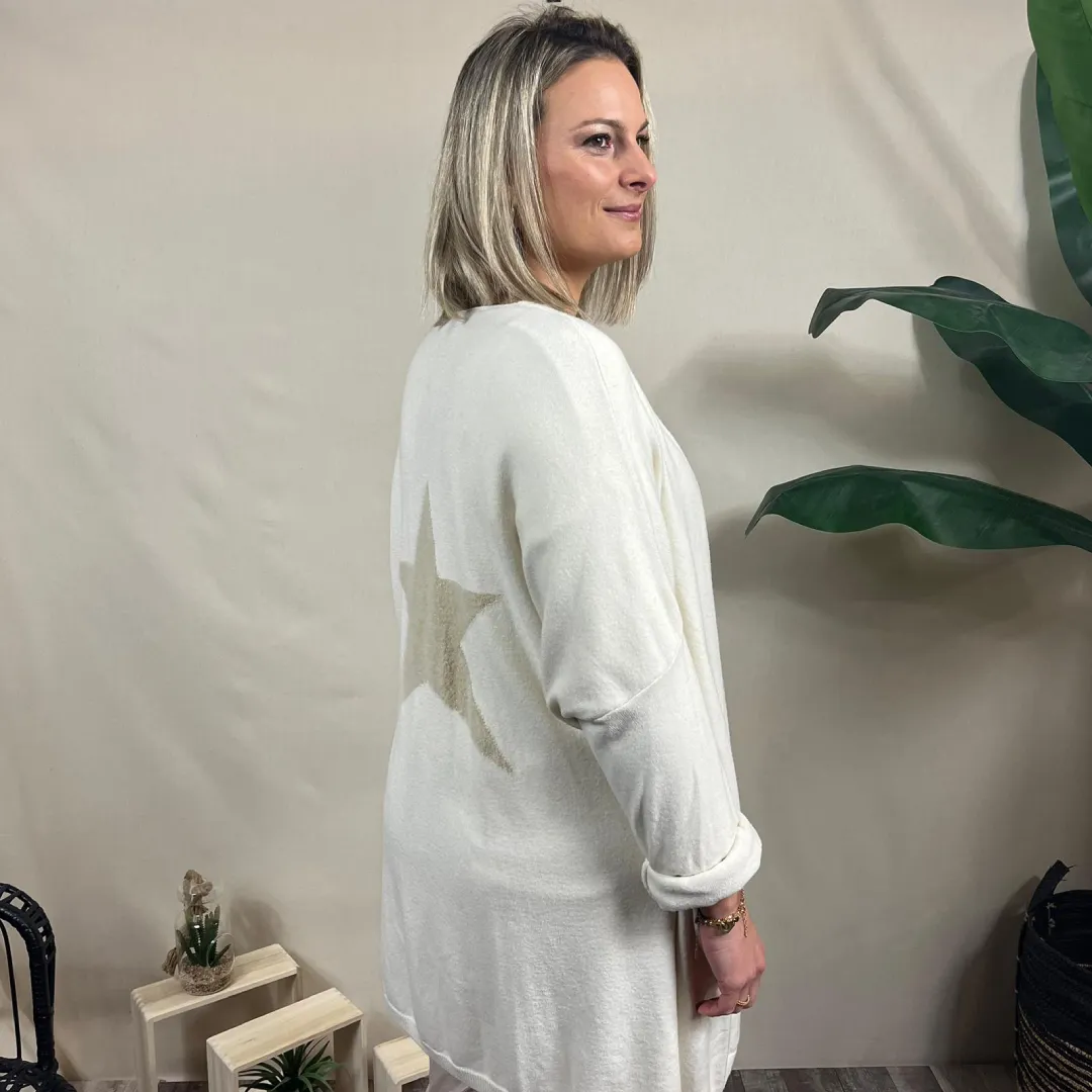 Ce gilet long sans fermeture allie confort et élégance avec sa coupe fluide et légère. Sa touche unique : une étoile discrète et scintillante dans le dos, qui apporte un charme subtil. Parfait pour la mi-saison, il offre chaleur sans alourdir. Intemporel et polyvalent, il s’adapte du 36 au 46, idéal pour toutes vos tenues.