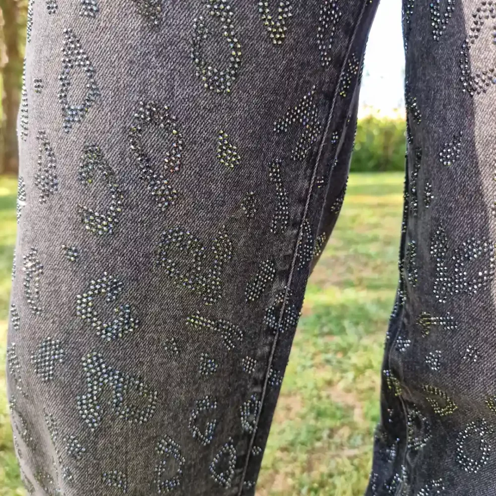 Ce qui rend ce jeans gris foncé oversize réellement unique, ce sont ses strass en motif léopard.