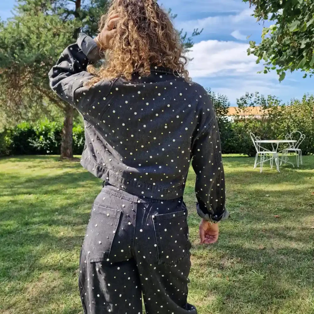 L’emplacement des perles et strass est pensé pour valoriser le jean sans jamais l’alourdir. Ils soulignent certaines lignes, illuminent la toile et créent un contraste subtil entre la rudesse du denim et la finesse des embellissements. Le résultat est un équilibre parfait entre audace et élégance, qui permet au jean de se porter aussi bien en journée qu’en soirée.