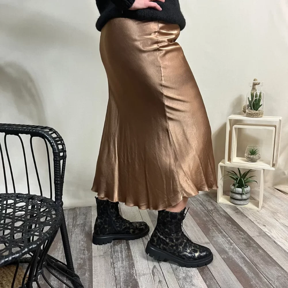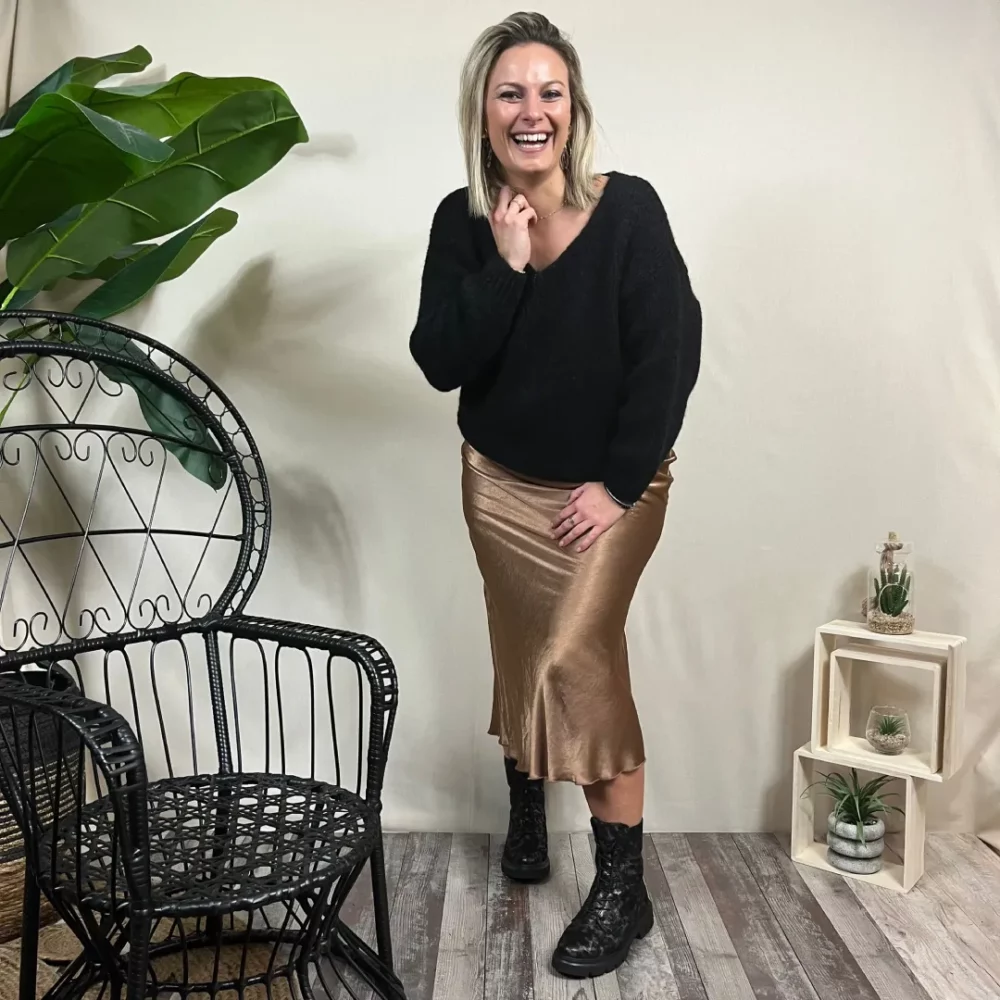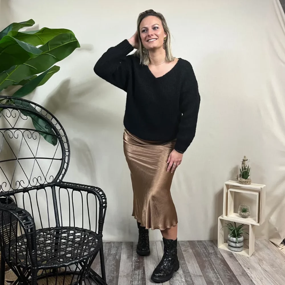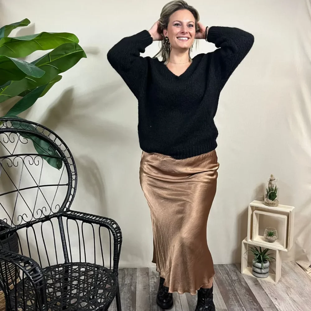 Pour un style urbain et décontracté, la jupe en satin peut être associée à un pull oversize en maille douce. Ce mélange de textures crée un effet de contraste très tendance, combinant la sophistication du satin avec la décontraction du pull. Pour parfaire ce look, une paire de bottines style rangers apporte une touche rock et affirmée, renforçant l’audace du style tout en restant confortable.