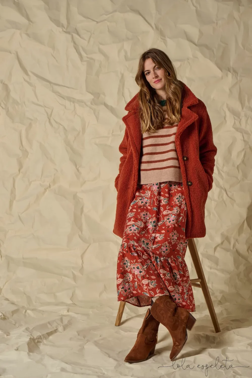 Manteau terracotta Lola Espeleta, coupe oversize tendance et confortable. Col large, poches plaquées et gros boutons pour un style chic-décontracté. Chaleur et douceur idéales pour l’automne-hiver. Polyvalent, il s’associe facilement à des looks bohèmes, casual ou élégants. Pièce phare pour illuminer vos tenues de saison.