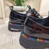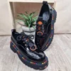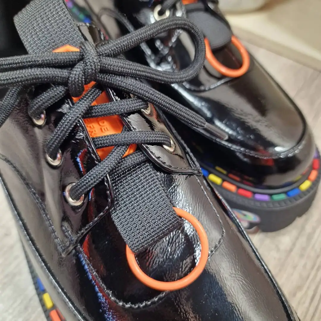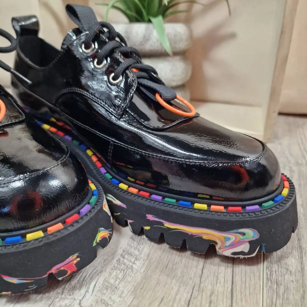 Un autre atout indéniable de cette chaussure réside dans sa capacité à transcender les saisons. Son cuir verni et sa semelle épaisse en font une alliée idéale pour l’automne et l’hiver, protégeant du froid et de l’humidité tout en restant respirante. Mais sa couleur noire brillante et ses détails multicolores en font également une chaussure estivale parfaite pour dynamiser des tenues plus légères. On peut facilement l’imaginer portée lors d’un festival, d’un concert ou d’une sortie entre amis. Sa résistance et sa praticité lui permettent de s’adapter à de nombreuses occasions, du quotidien le plus banal aux moments festifs.