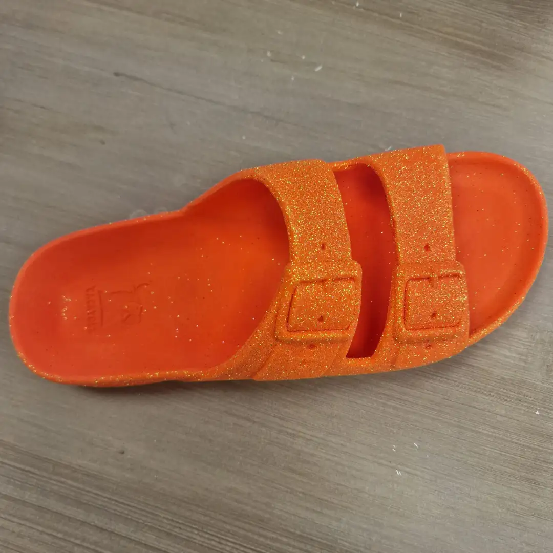 Illuminez vos pas avec la mule orange fluo pailletée Cacatoès à 49.90€. Directement venue du Brésil, cette sandale unique diffuse une irrésistible senteur bonbon. Waterproof, durable et ultra-confortable avec ses brides ajustables, elle marie l’énergie néon de l’orange à l’éclat des paillettes. Un concentré de style vitaminé et de gourmandise pour un été inoubliable au parfum d’enfance.