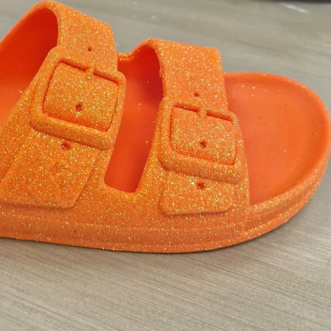 Le modèle présenté ici arbore une robe d’un orange fluo éclatant entièrement recouverte de paillettes intégrées à la matière. Ce n’est pas un simple saupoudrage superficiel, mais un mélange homogène qui garantit que vos mules garderont leur éclat sans perdre de leur superbe au fil du temps.