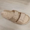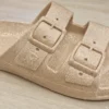 Le modèle présenté ici arbore une robe d’un sable beige lumineux entièrement recouverte de paillettes intégrées à la matière. Ce n’est pas un simple saupoudrage superficiel, mais un mélange homogène qui garantit que vos mules garderont leur éclat sans perdre de leur superbe au fil du temps.