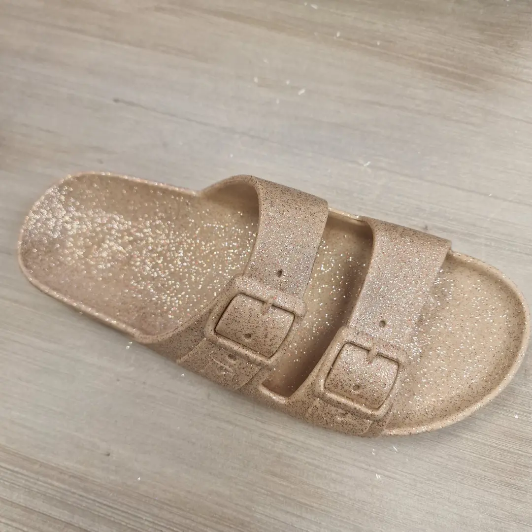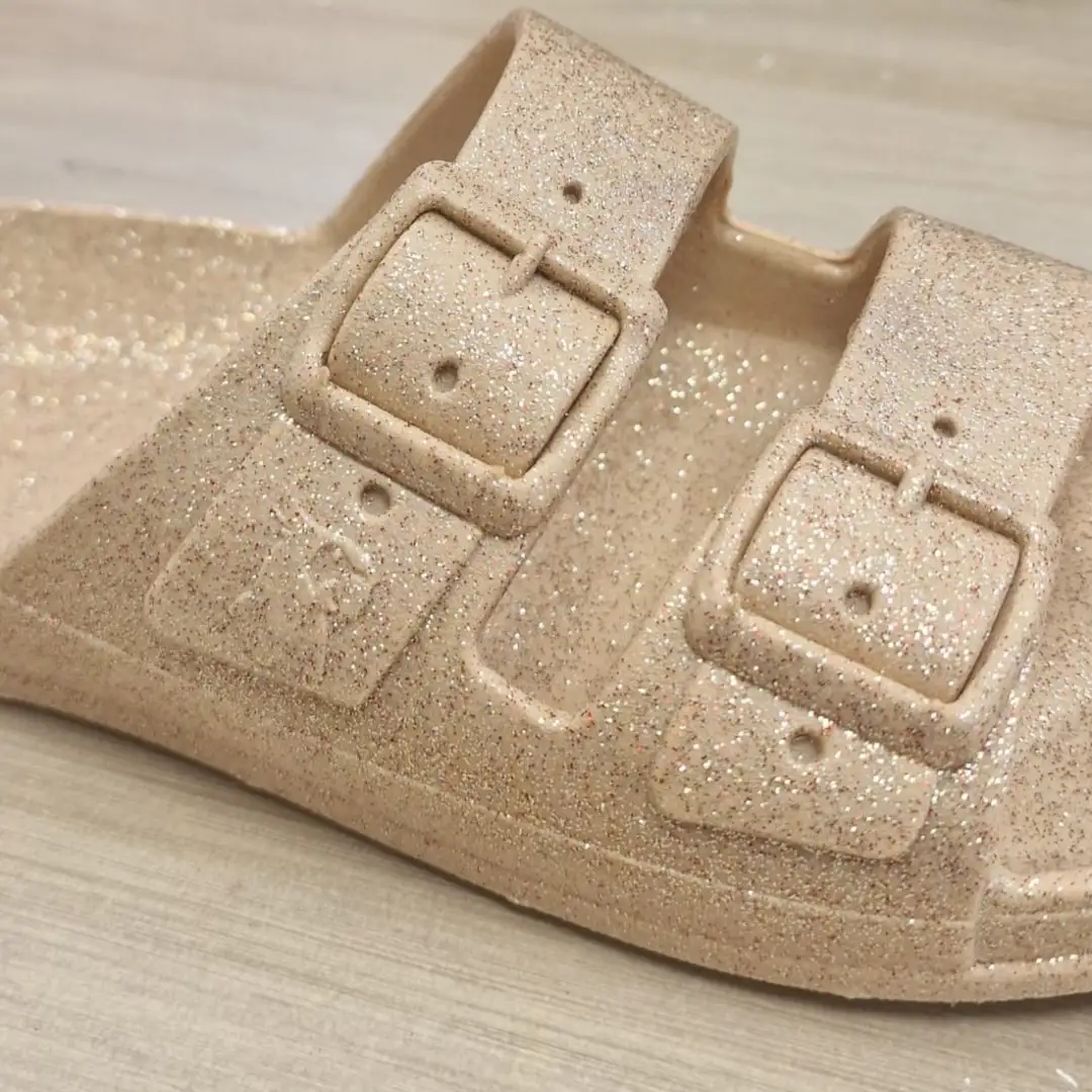 Illuminez vos pas avec la mule sable pailletée Cacatoès à 49.90€. Directement venue du Brésil, cette sandale unique diffuse une irrésistible senteur bonbon. Waterproof, durable et ultra-confortable avec ses brides ajustables, elle marie la douceur du coloris sable à l’éclat des paillettes. Un concentré de style naturel et de gourmandise pour un été inoubliable au parfum d’enfance.