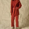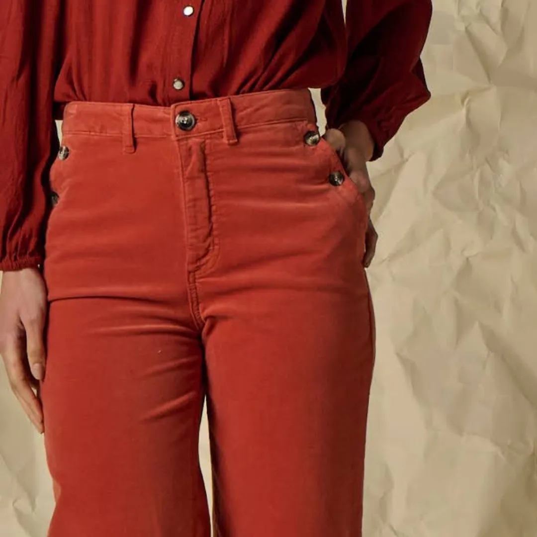 La couleur terra cotta séduit par son intensité et sa chaleur. Inspirée des nuances de la terre cuite, elle reflète à la fois la douceur des teintes naturelles et l’éclat des couleurs automnales. Ce pantalon se porte aussi bien au quotidien que lors de moments plus habillés, en fonction des associations choisies. Il s’agit d’une pièce forte qui attire l’œil tout en restant facile à intégrer dans une garde-robe féminine.
