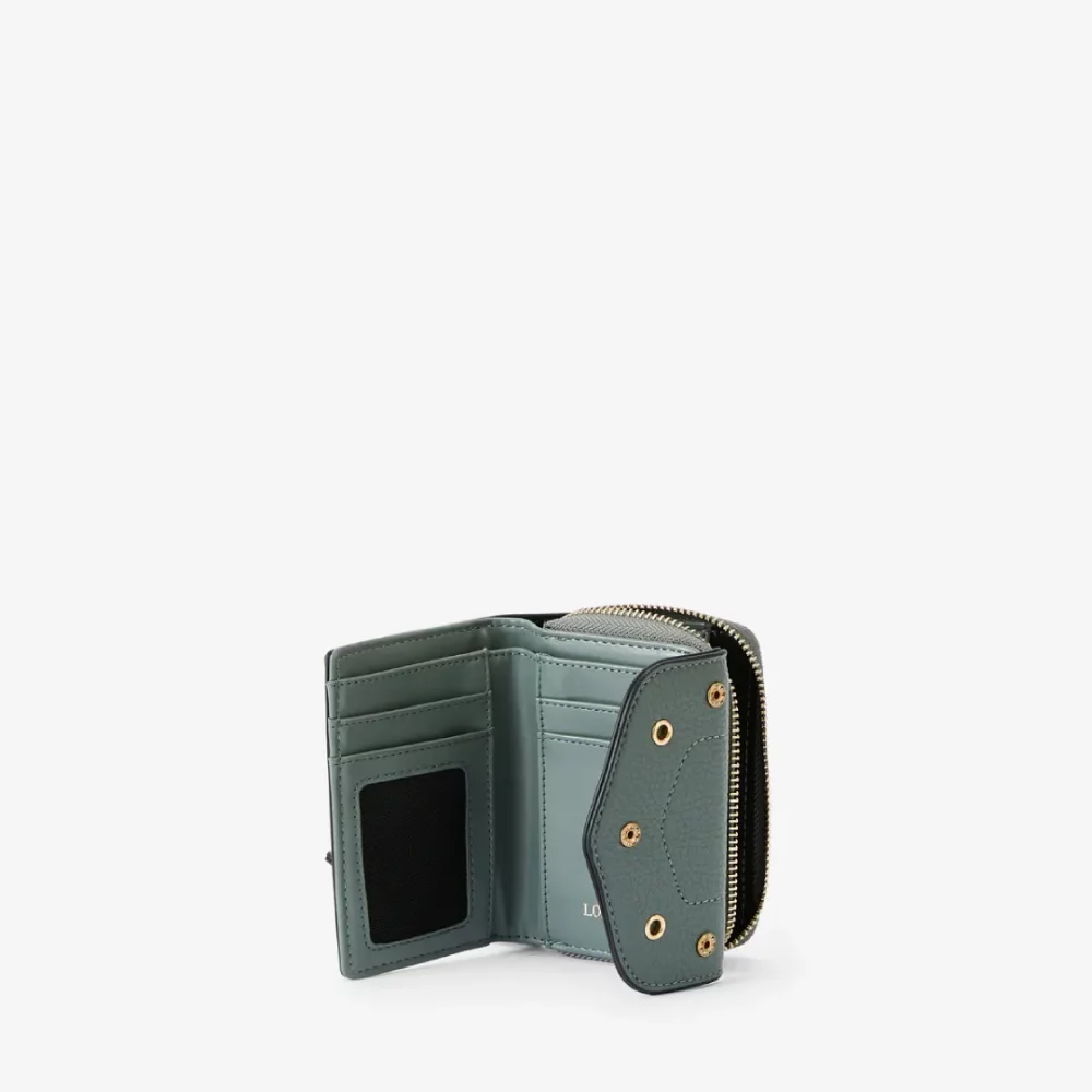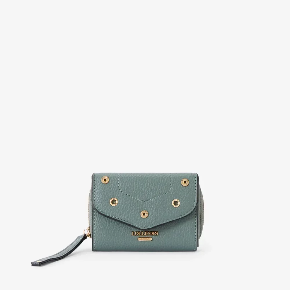 Portefeuille Lollipops Rogers en simili cuir grainé bleu vegan. Détails œillets fantaisie, logo doré en relief. Compact (12×9×2 cm) avec rabat pressionné, 6 porte-cartes et compartiment zippé. Élégant et pratique, il se glisse facilement dans un sac ou une pochette pour un style chic au quotidien.