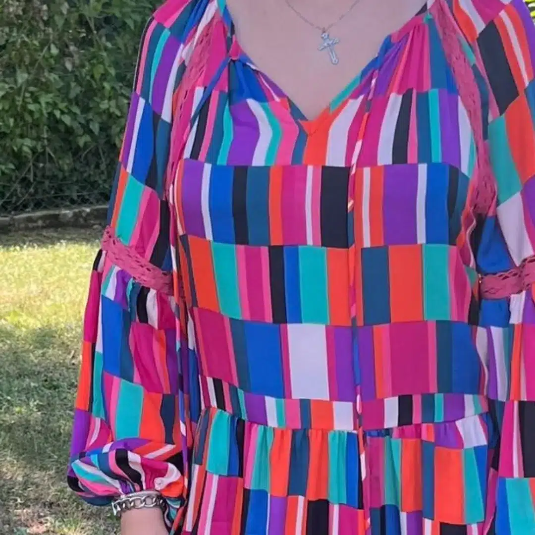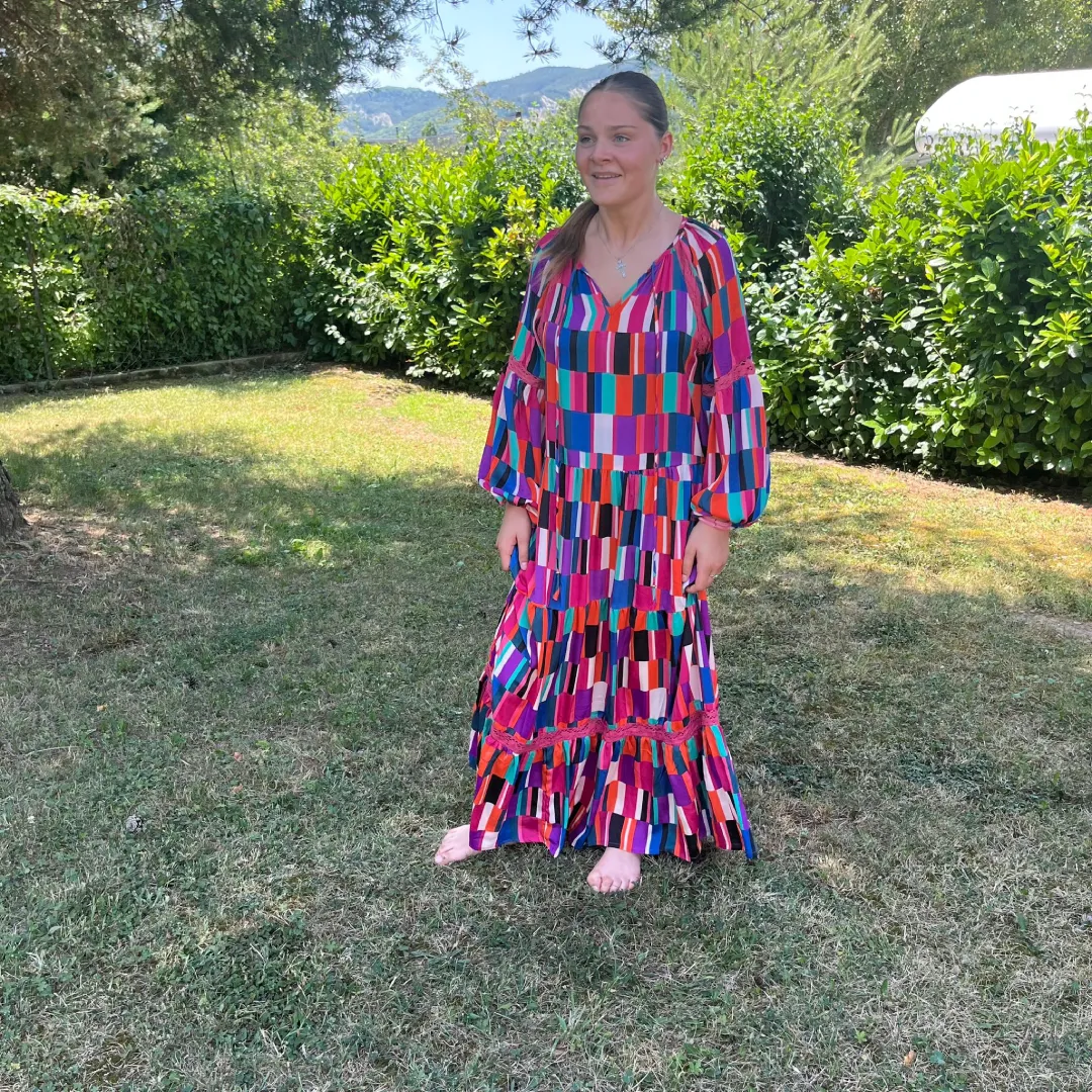 La robe longue style Arlequin se distingue par son motif en losanges multicolores dominé par le violet, alliant audace et élégance. Sa coupe fluide offre confort et charme, idéale pour toutes occasions. Facile à accessoiriser, elle s’adapte aussi bien à un look chic qu’à un style casual. Un choix parfait pour exprimer créativité et personnalité.