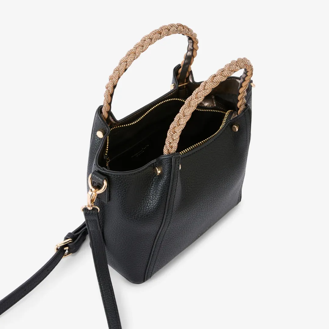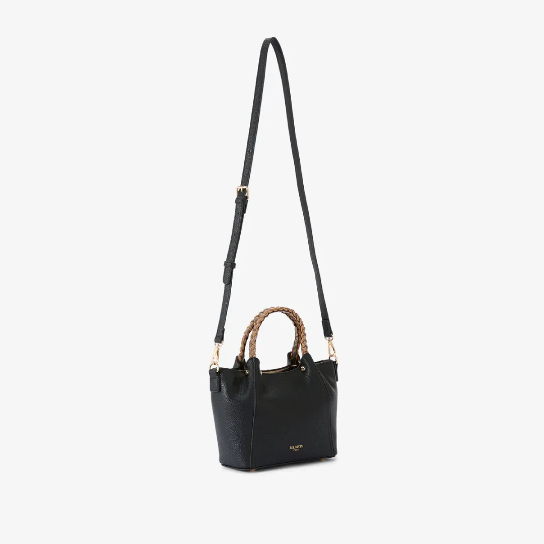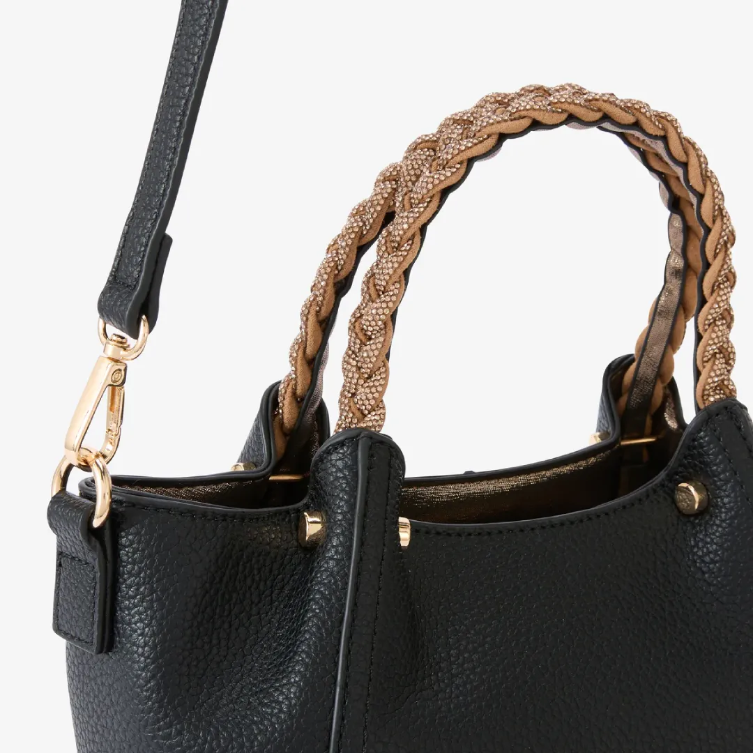 Mini Sac Shopping Lollipops Noir en simili cuir grainé avec anses tressées à paillettes. Compact et élégant, il dispose d’un compartiment zippé, poches intérieures, poche dorsale et bandoulière amovible. Parfait pour un usage quotidien ou en soirée, il combine style, praticité et finitions haut de gamme.