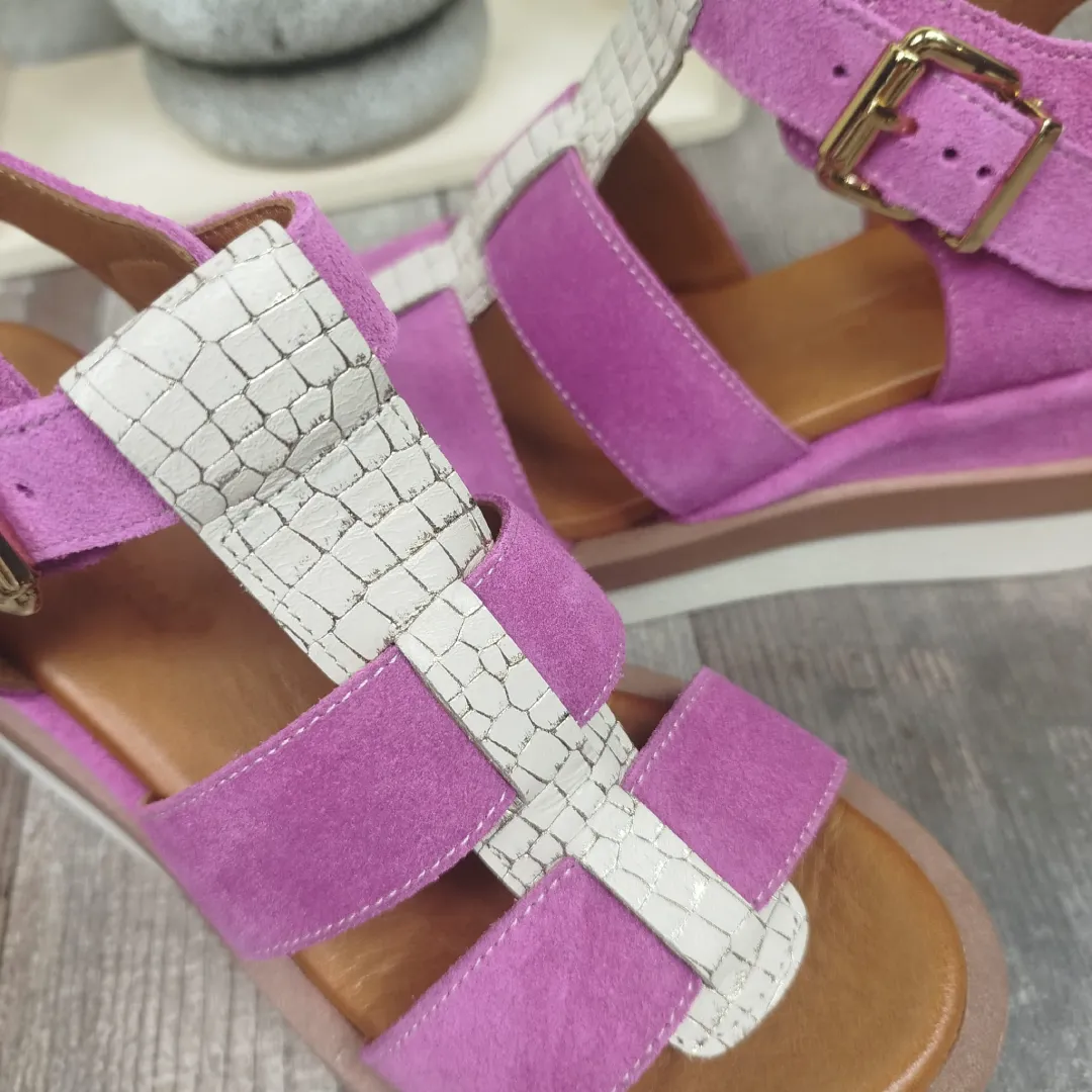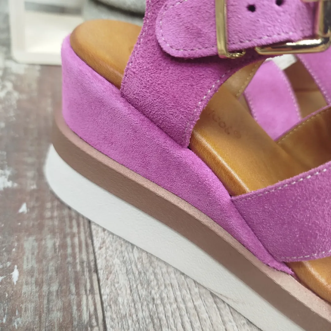 Apportez une touche d’élégance colorée à votre été avec ces sandales Carmela en cuir suédé rose fuchsia. Leur semelle compensée garantit confort et stabilité, tandis que les larges lanières assurent un maintien optimal. La boucle ajustable à la cheville permet un ajustement parfait, et un détail blanc métallisé ajoute une note sophistiquée. Parfaites pour un style tendance et confortable.