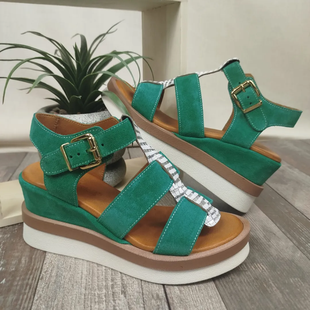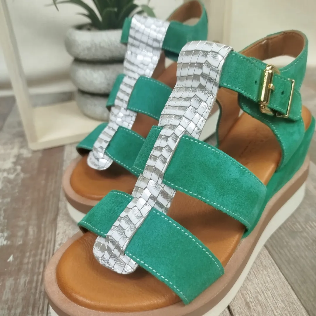 Apportez une touche de fraîcheur et d’élégance à votre été avec ces sandales Carmela en cuir suédé vert prairie. Leur couleur vive et pleine de pep’s illumine instantanément vos tenues estivales. La semelle compensée offre un confort optimal tout en garantissant une bonne stabilité. Les larges lanières en cuir assurent un maintien parfait, et la boucle réglable à la cheville permet un ajustement personnalisé. Un détail blanc métallisé sur l’une des lanières ajoute une note chic et originale. À la fois tendance et agréables à porter, ces sandales sont idéales pour allier style et confort au quotidien.