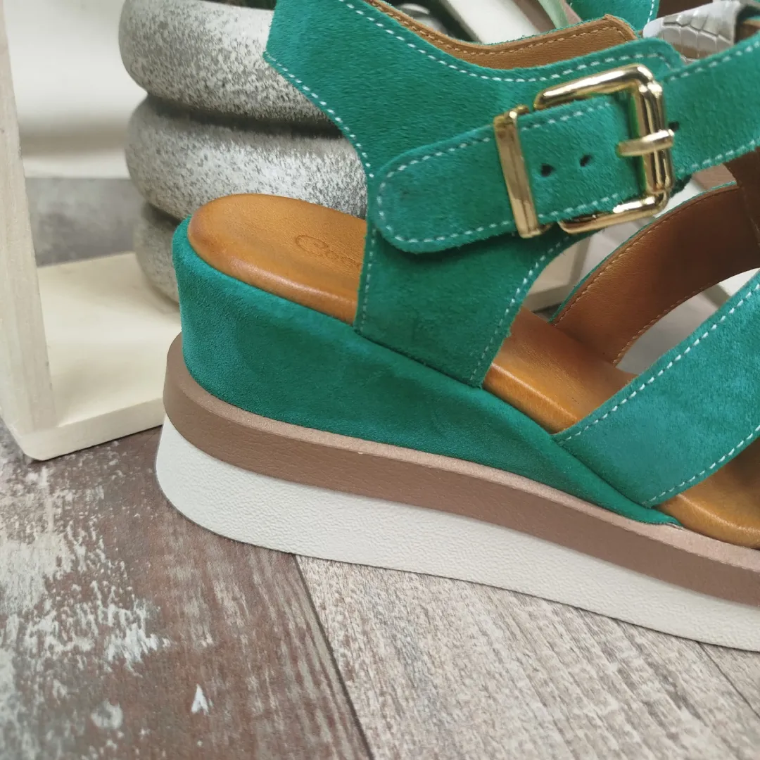 Apportez une touche de fraîcheur et d’élégance à votre été avec les sandales Carmela en cuir suédé vert prairie