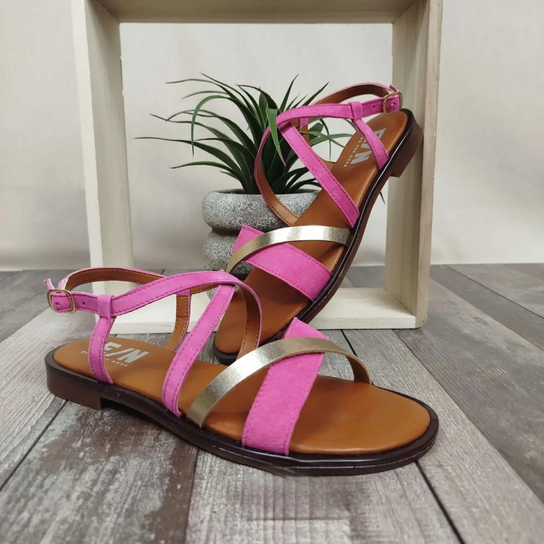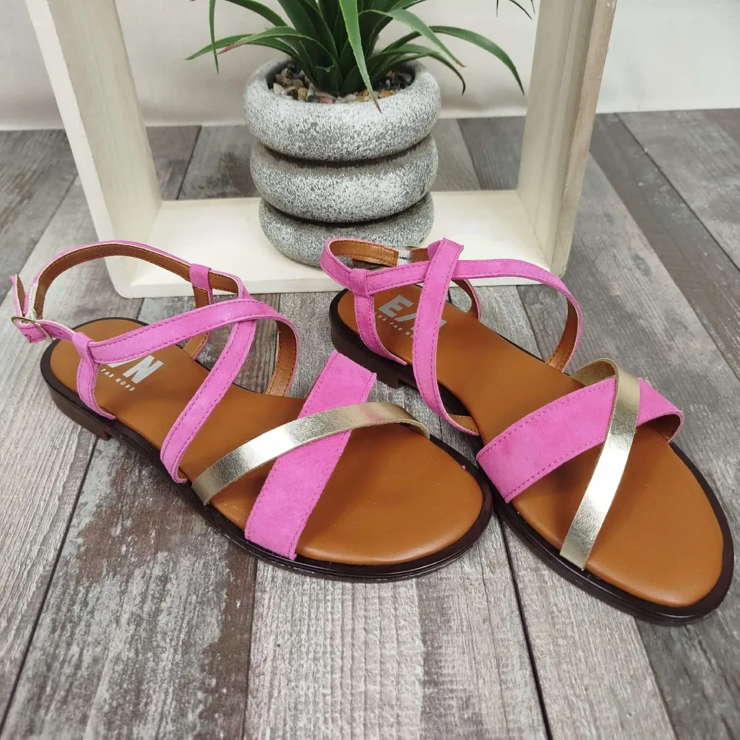Ces sandales fuchsia en suédine avec touches dorées sont la parfaite alliance entre style, confort et praticité. Leur design élégant et original, associé à des détails soigneusement choisis, fait d’elles un choix évident pour la saison estivale.