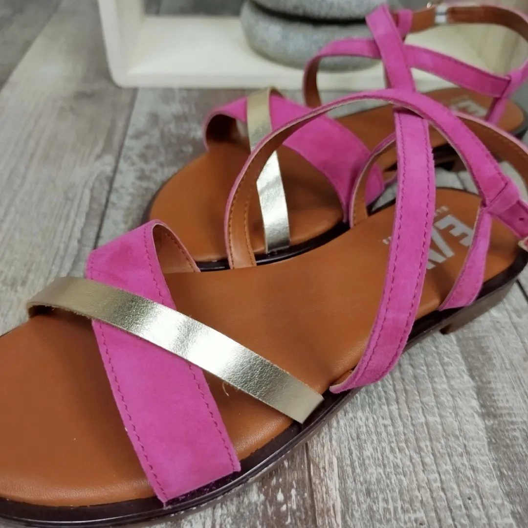 Ce modèle de sandales est à la fois élégant et tendance, parfait pour la saison estivale. Avec ses lanières en suédine fushia et ses touches dorées métalliques, il apporte une touche féminine et sophistiquée. La semelle marron clair offre un joli contraste, tandis que la fermeture à boucle permet un ajustement confortable. Les lanières entrecroisées à l’avant du pied ajoutent du style et de l’originalité. Idéal pour une tenue décontractée ou plus habillée, ce modèle se porte facilement en ville, en vacances ou lors de sorties estivales.