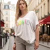 Ces lettres en relief offrent une texture intéressante au toucher et une profondeur visuelle qui attire l’œil sans être agressive. C’est le vêtement idéal pour celles qui aiment exprimer leur personnalité à travers des détails graphiques et ludiques.
