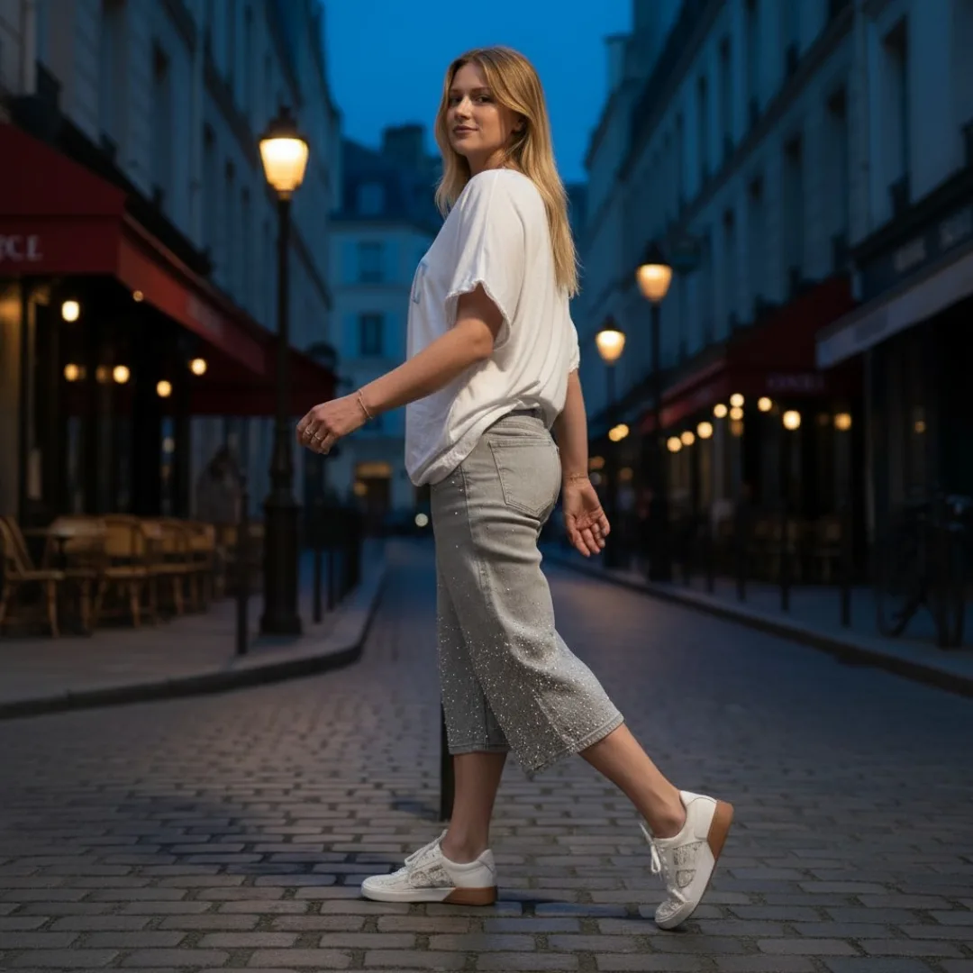 * Option Estivale : Portez-le sur un short en jean cycliste pour un look très années 90, ou sur une jupe longue fluide pour un style bohème urbain. Des sandales à lanières ou des espadrilles seront vos meilleures alliées.