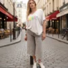 L’encolure en V apporte une touche de féminité immédiate. Elle dégage délicatement le cou et permet de mettre en valeur vos colliers préférés, qu’il s’agisse de chaînes dorées superposées ou d’un pendentif minimaliste. Les manches courtes et larges renforcent cet aspect décontracté, idéal pour les journées ensoleillées où l’on recherche de la fraîcheur.