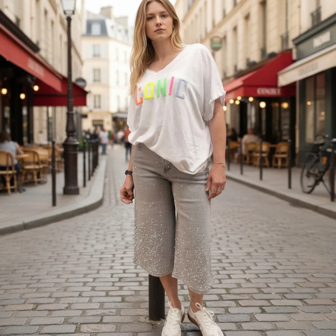 * Look Urbain Décontracté : Associez-le à un jean gris délavé orné de strass, comme présenté sur notre photo. Les petits détails brillants du pantalon feront écho aux couleurs vives de l’inscription Iconic. Complétez avec une paire de baskets blanches impeccables.