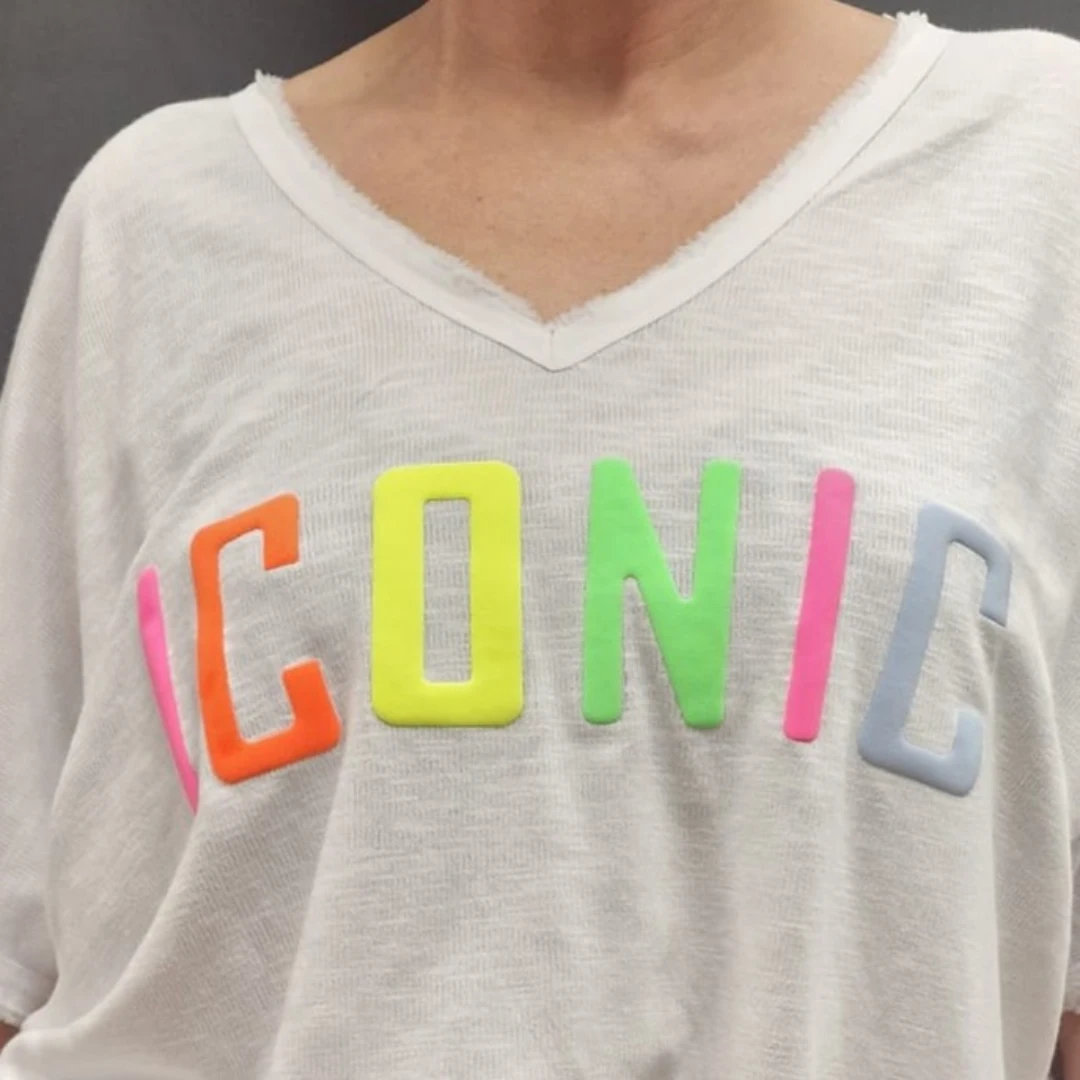 Le véritable point focal de cette pièce est sans aucun doute son inscription frontale. Le mot Iconic s’affiche fièrement dans une typographie grasse et moderne. Ce qui fait la différence, c’est l’utilisation de couleurs néon et pastels qui apportent une énergie incroyable à l’ensemble :