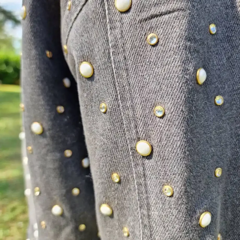 Sous la lumière, les strass captent les reflets et attirent le regard, tandis que les perles offrent une dimension élégante et intemporelle. Ce contraste entre la rusticité du jean et le raffinement des embellissements crée une alchimie unique : un mélange audacieux de chic et de décontraction.