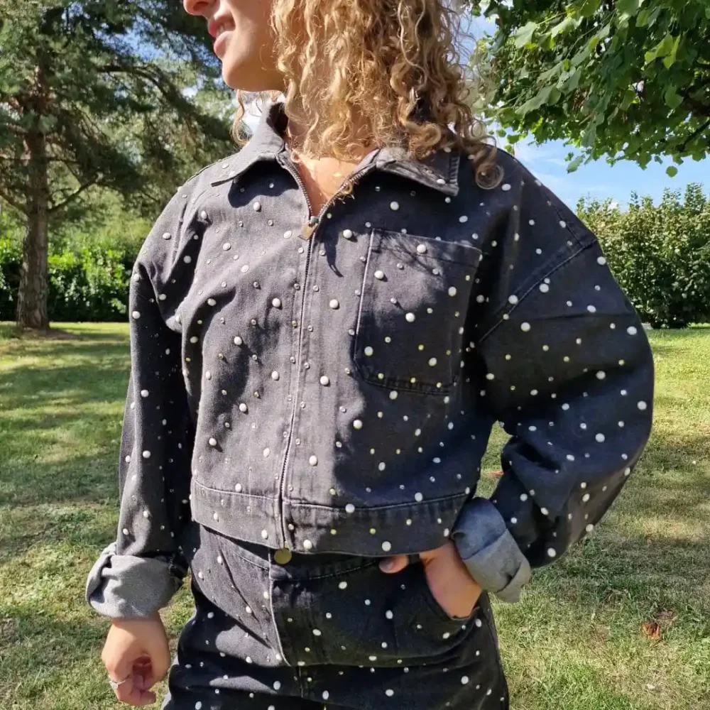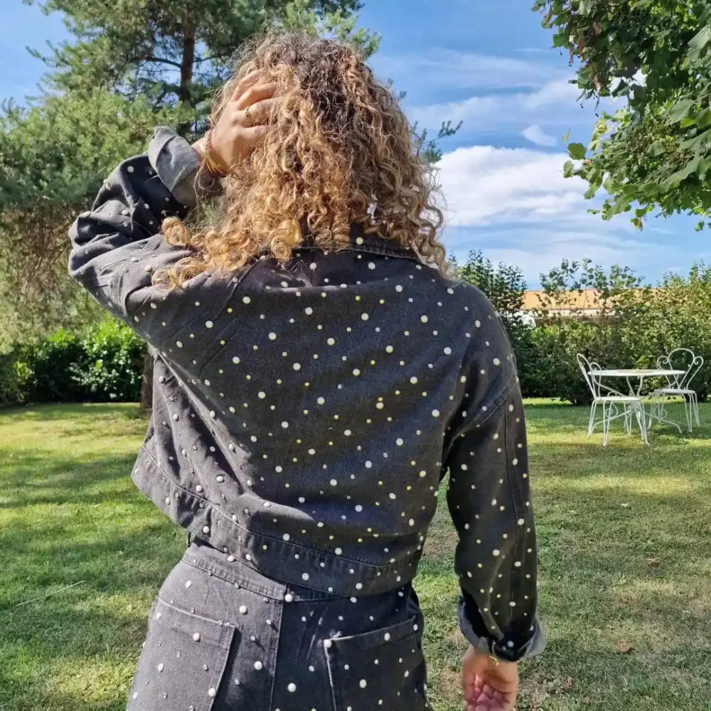 Placés avec soin, ils illuminent la toile denim et transforment une pièce basique en un vêtement d’exception. Ces ornements apportent une touche glamour, sophistiquée et festive, tout en restant subtils et raffinés.