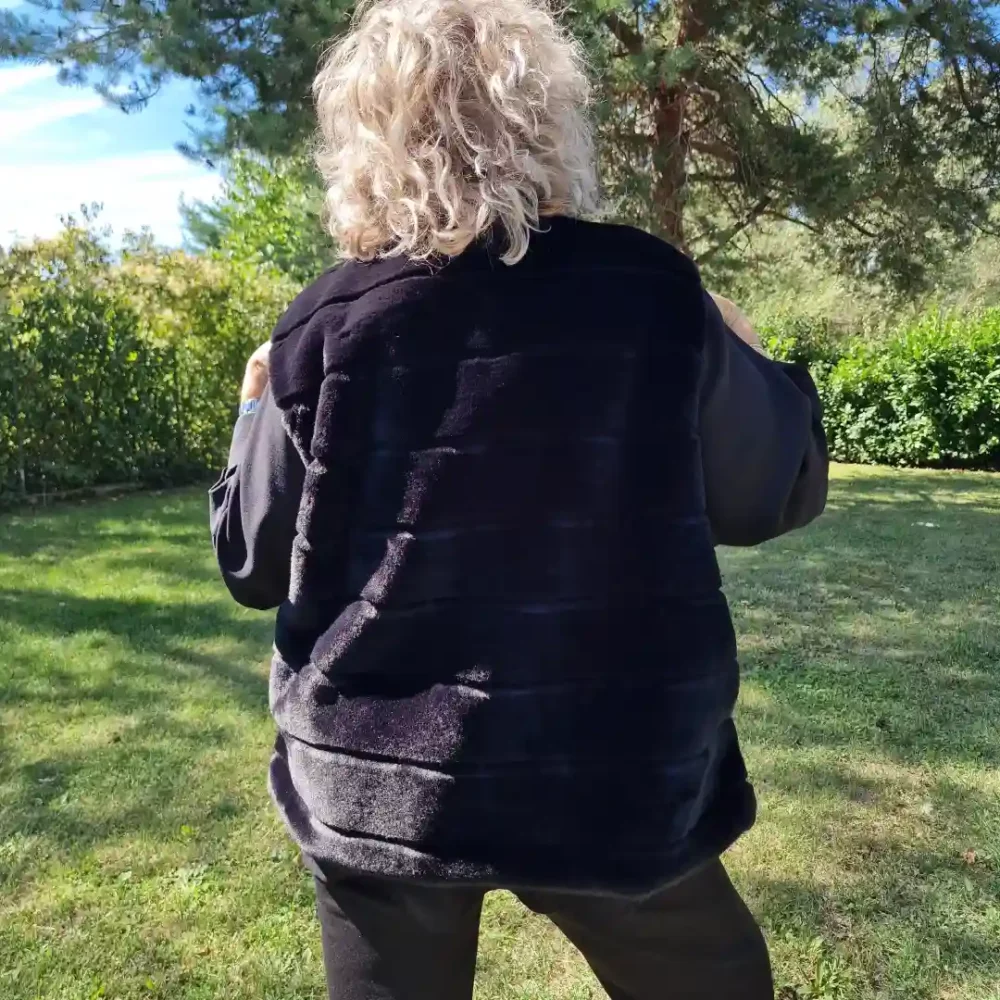 La composition synthétique de cette veste permet un entretien simple. Il est conseillé de la laver à la main ou en machine en programme délicat, à froid. Le séchage à plat est recommandé, loin de toute source de chaleur. Grâce à ces précautions, la matière conserve sa douceur et son aspect duveteux lavage après lavage.
