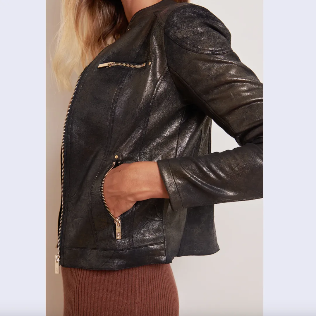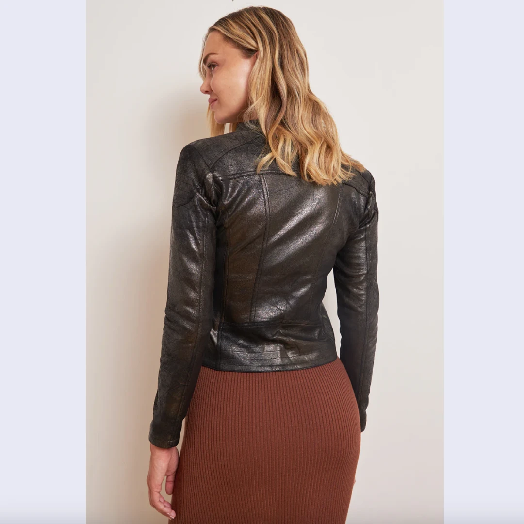 Le noir est intemporel, mais la veste Gypsie va plus loin en le sublimant grâce à un effet foil métallisé discret et raffiné. Ce détail apporte une brillance subtile, qui capte la lumière et confère à la veste une allure à la fois glamour et sophistiquée. Résultat : une pièce qui attire le regard sans jamais tomber dans l’excès.