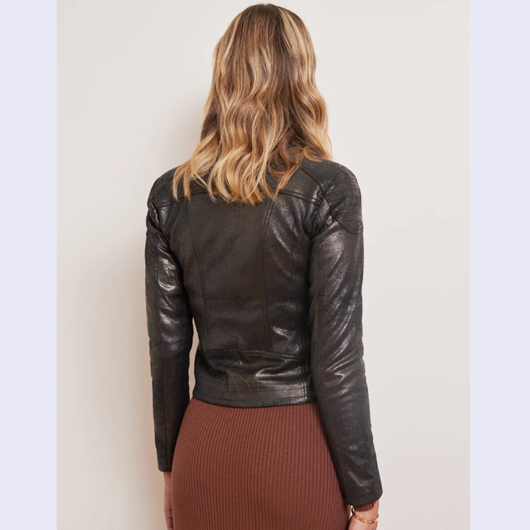 La veste Gypsie noir foil femme est bien plus qu’un simple perfecto. Elle est une pièce statement, capable de transformer une tenue basique en un look affirmé et sophistiqué. Son design soigné et son éclat subtil en font un atout mode indispensable pour celles qui veulent allier chic et audace.